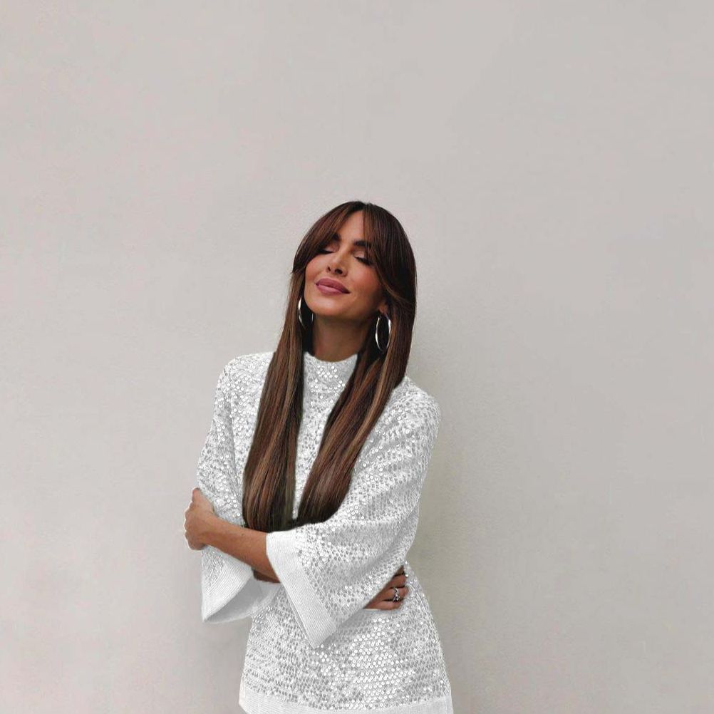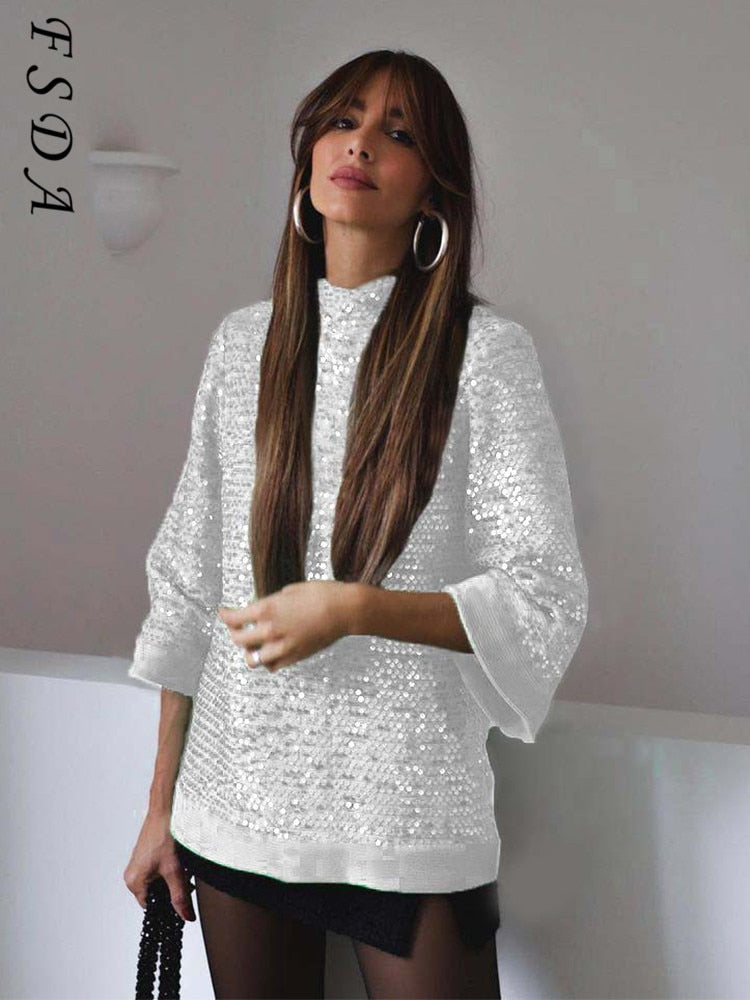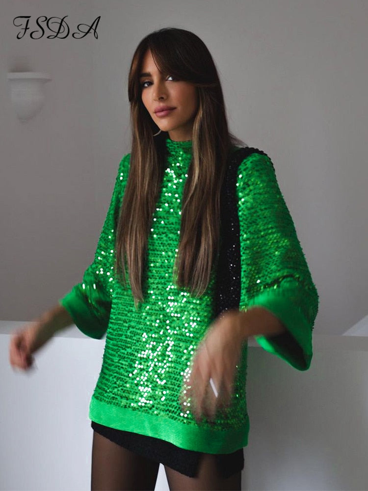 FSDA O Neck 2021 Fashion Green Sequins Blouse Shirts Women Y2K Autumn Winter Vintage Long Sleeve Top Shirt Elegant Casual