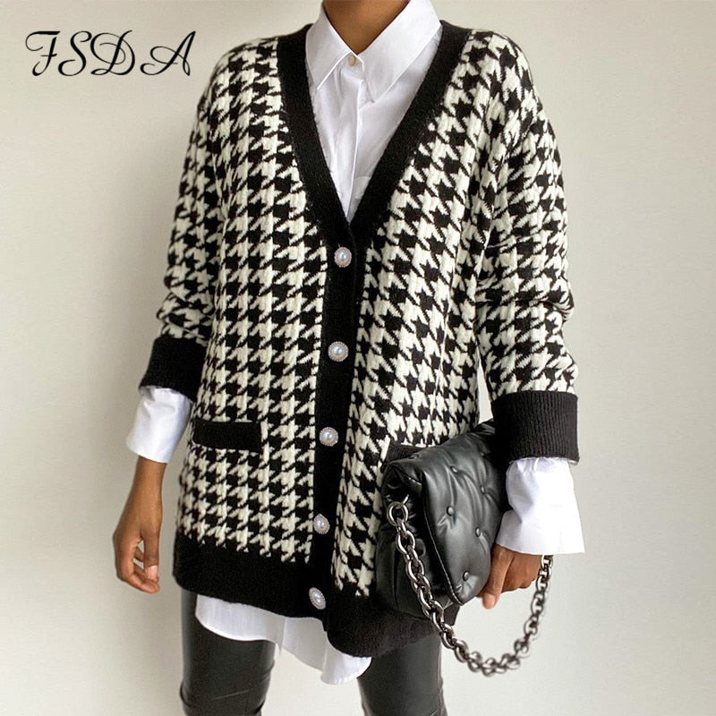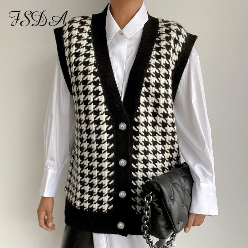 FSDA V Neck Houndstooth Vest Cardigan 2020 Black Sleeveless Sweater Women Loose 2020 Autumn Winter Knitted Casual Fashion Jumper