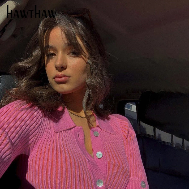 Hawthaw Women Autumn Winter Long Sleeve Knitted Pink T Shirt Crop Tops Топ Женский 2021 Fall Clothes Wholesale Items Haut Femme