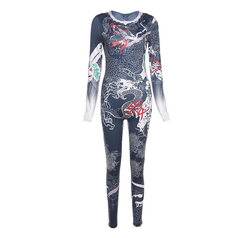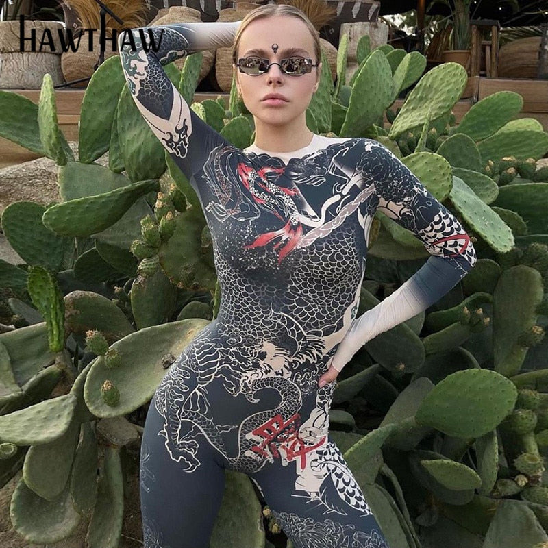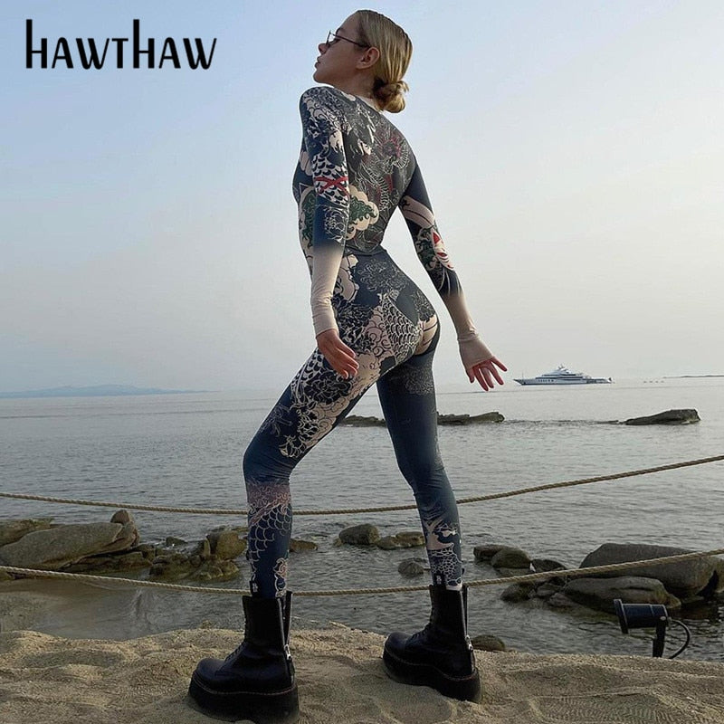 Hawthaw Women Autumn Winter Long Sleeve Printed Bodycon Jumpsuit Overall Macacão Feminino 2021 Fall Wholesale Lots Bulk Clothes