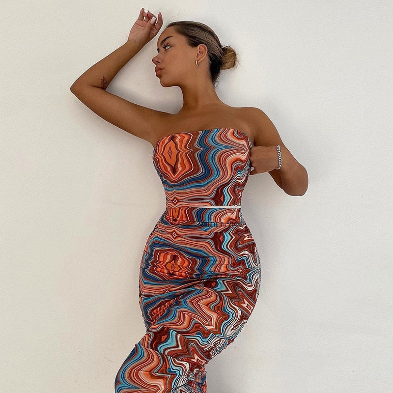 Hawthaw Women Fashion Summer Strapless Sleeveless Printed Bodycon Package Hip Tube Dress 2021 Female Clothing Streetwearkl