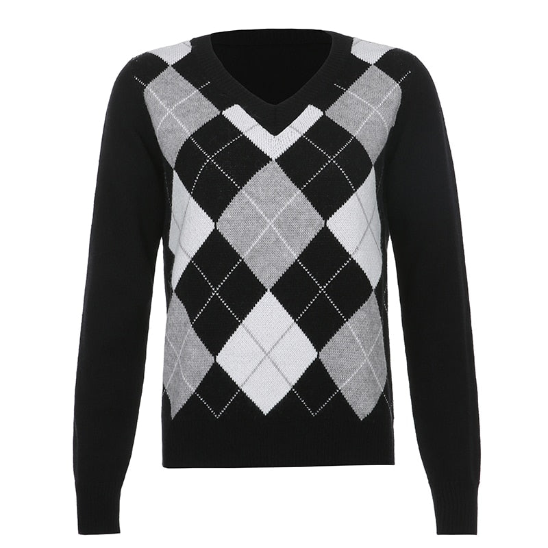 HEYounGIRL Autumn Black V Neck Vintage Knit Sweater Casual Argyle Plaid Jumper Women 90s Preppy Style Long Sleeve Pullover 2021