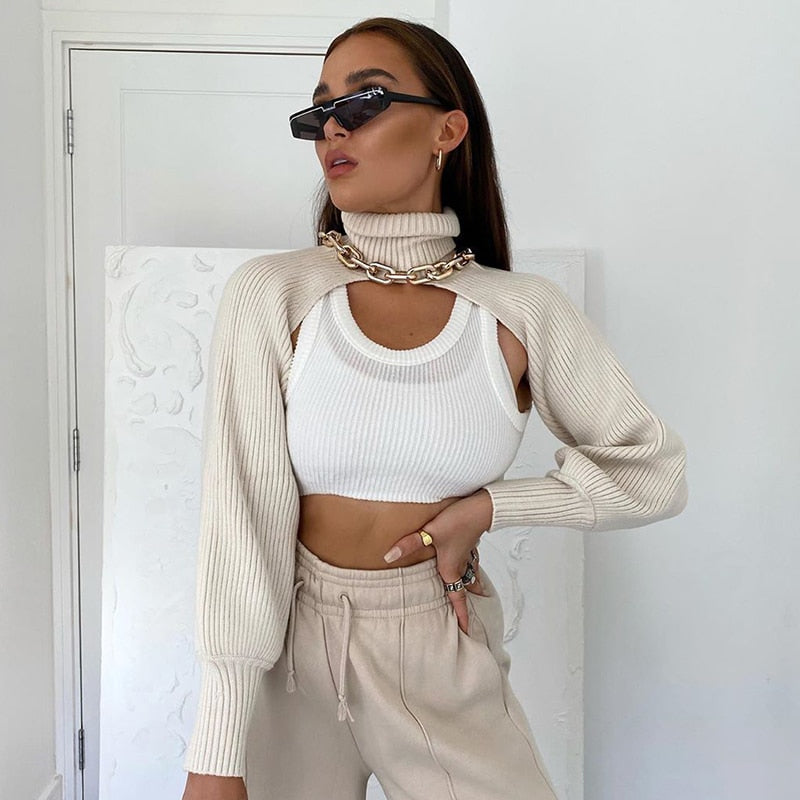HEYounGIRL Casual Turtleneck Crop Top Sweater Women Smocked Solid Vintage Knitted Jumpers Ladies Fashion Long Sleeve Pullover