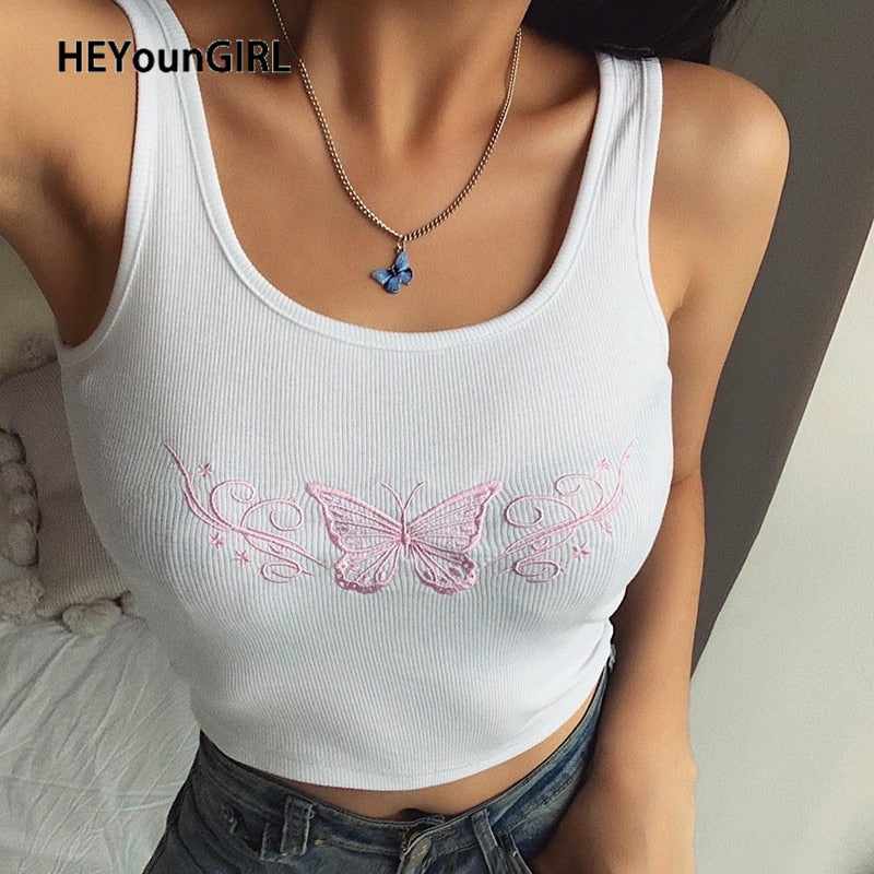 HEYounGIRL Embroidery Butterfly Women Tank Tops Tees Summer Sleevless Casual Crop Top Ladies White Fashion Mini Vest Streetwear