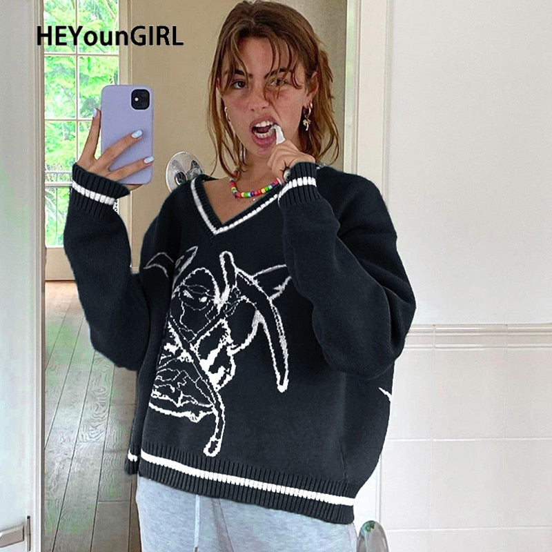 HEYounGIRL  Preppy Style Oversized Knitted Sweater Women Casual V Neck Autumn Jumper Ladies Print Fashion Pullover Knitwear 2021