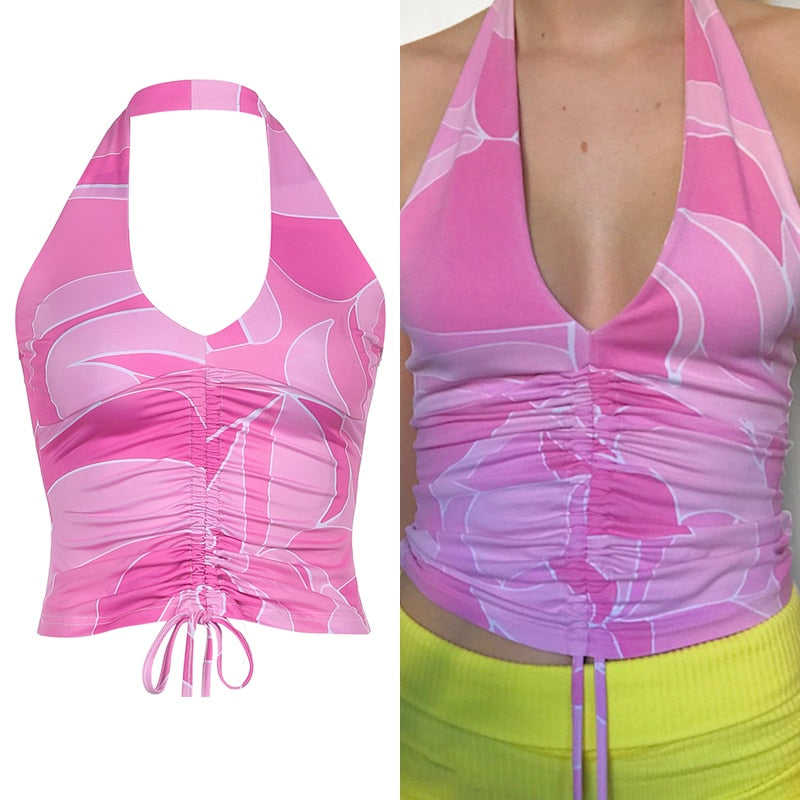 HEYounGIRL Summer Print Sleeveless Backless Tank Top Women V Neck Sexy Halter Crop Tops Tees Vintage Fashion Camisole Streetwear
