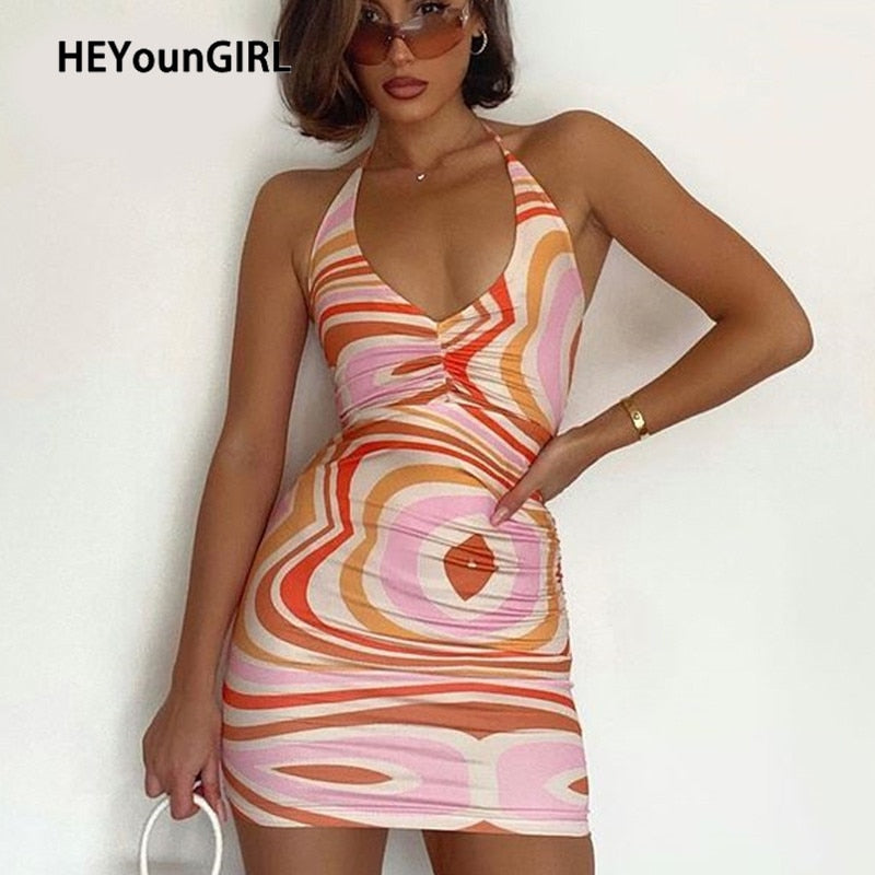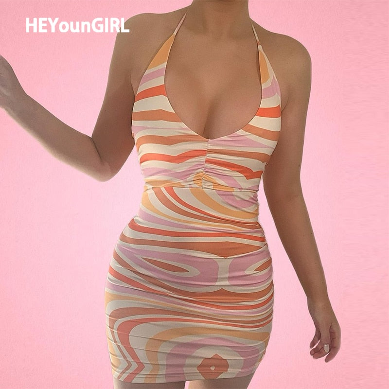 HEYounGIRL V Neck Sexy Bodycon Halter Tank Dress Woman Printed Lace Up Sleeveless Backless Mini Dresses Ladies Fashion Street