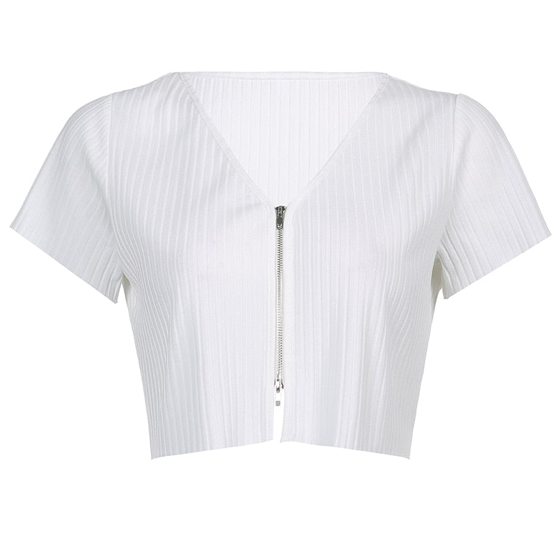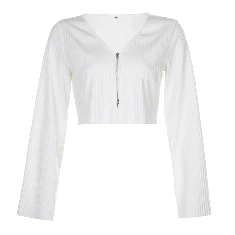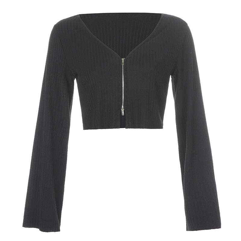 HEYounGIRL Zipper Casual Loose Long Sleeve Cropped Tshirt Autumn Fashion V Neck Crop Top T Shirt Women Chic Cotton Streetwear