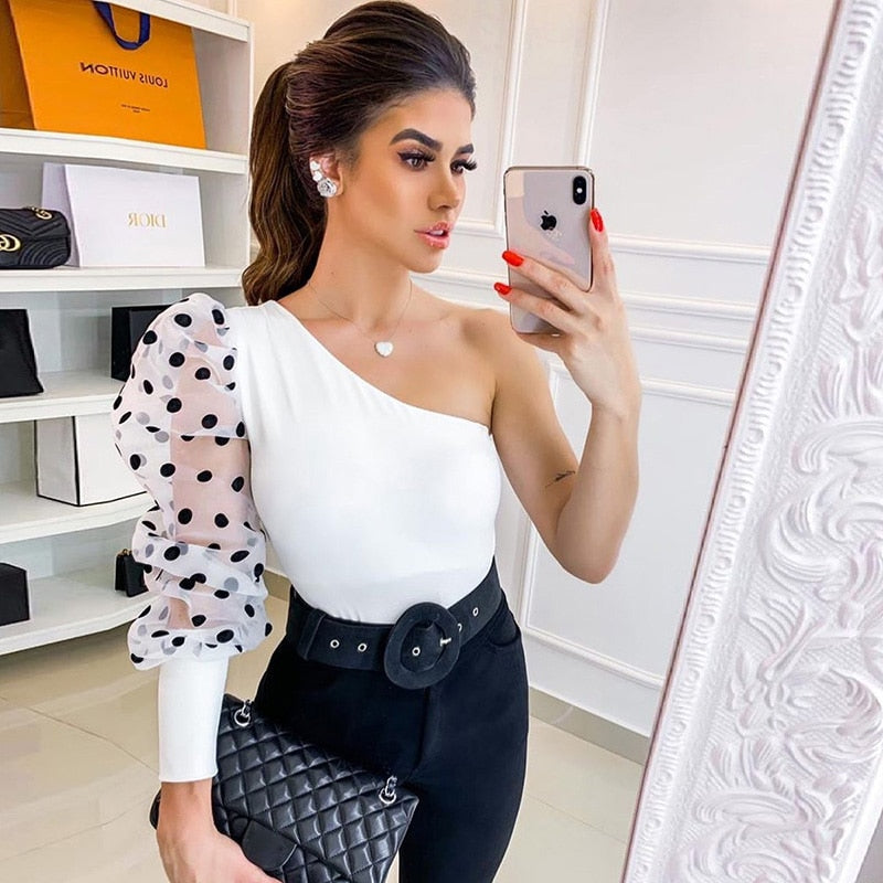 hirigin New Women One Shoulder Blouse Sexy Dots Puff Sleeve Shirts Spring Summer Office Lady Skew Collar Tops Slim Blouse