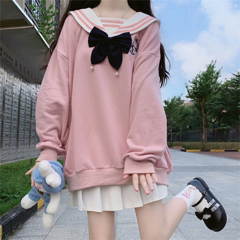 Hoodies and Sweatshirts Women Sweety Kawaii Loose Autumn Winter Hoodies Casual Oversize Pullovers Sailor Collar Bow Sweatshirts
