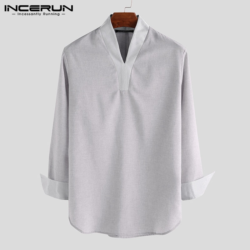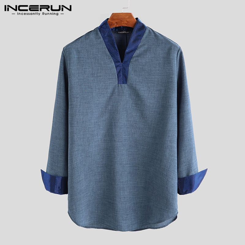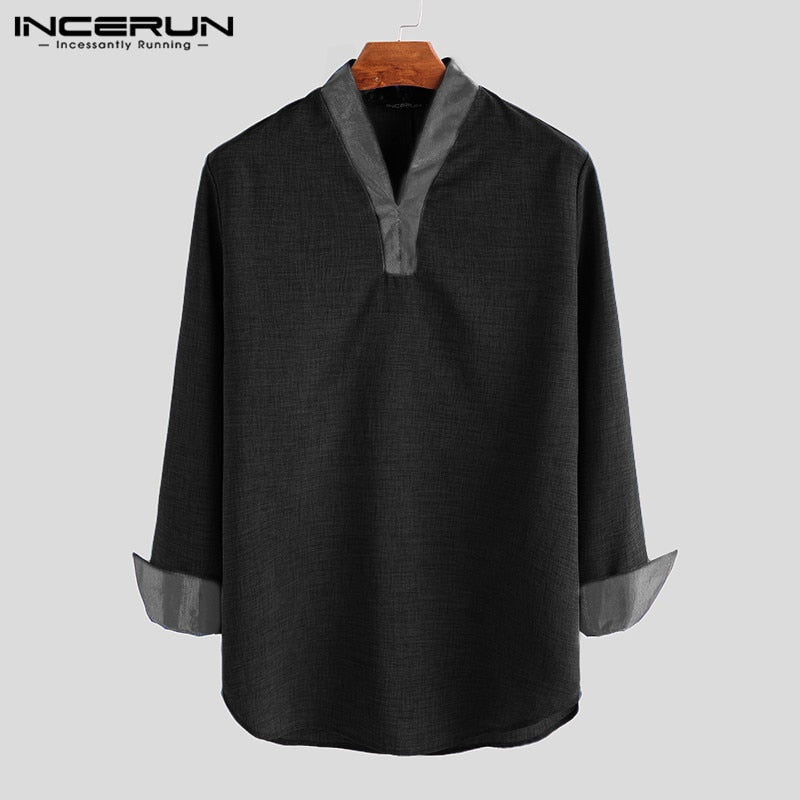 INCERUN Men Shirt Streetwear V Neck Long Sleeve Patchwork Fitness Vintage Casual Shirts Men Indian Clothes Plus Size 2022