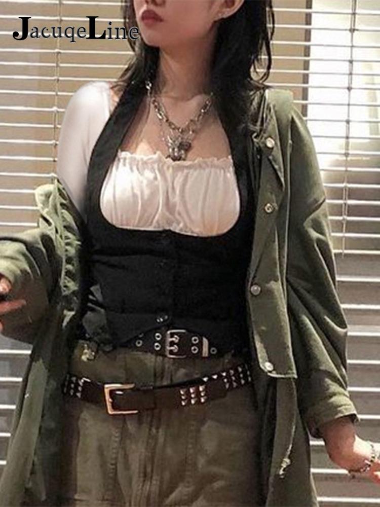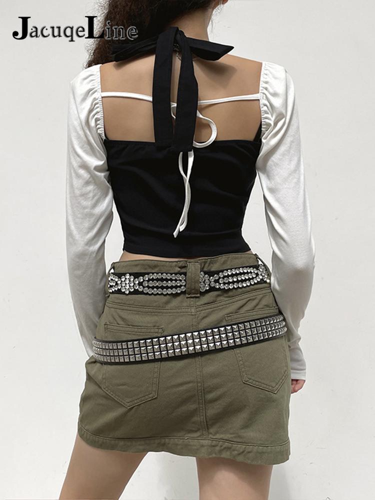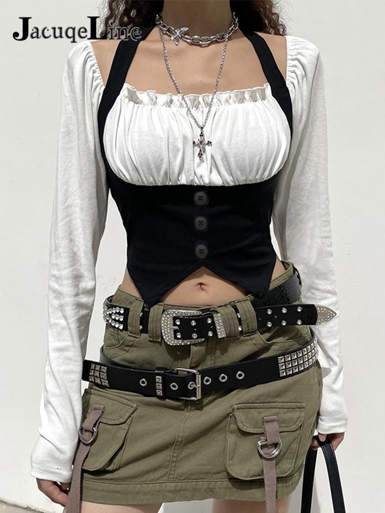 Jacqueline 2022 Y2K Korean Retro Fairy Grunge Tee Button Ruched Crop Top Long Sleeve Harajuku Sweet Cute Kawaii T Shirt Women