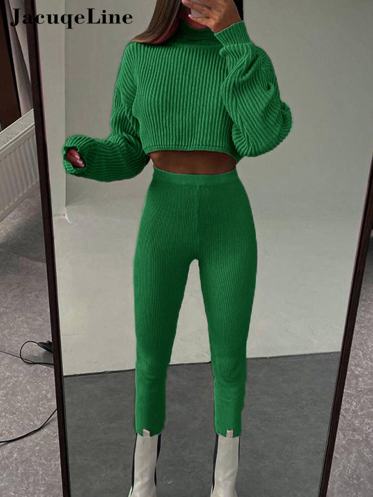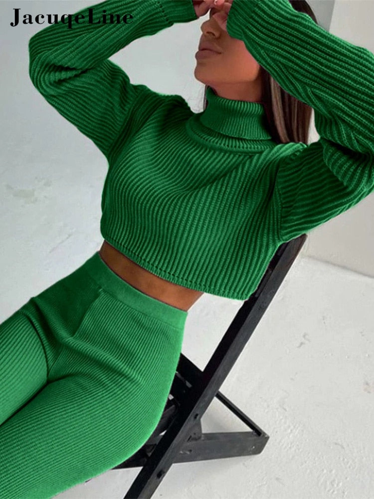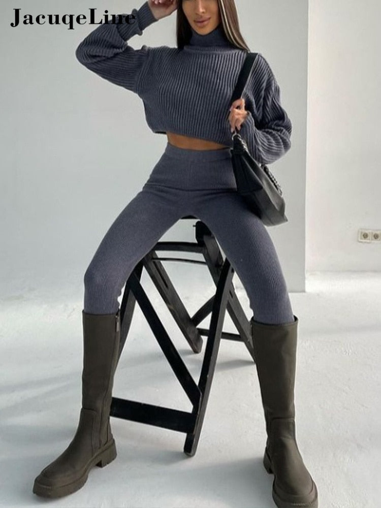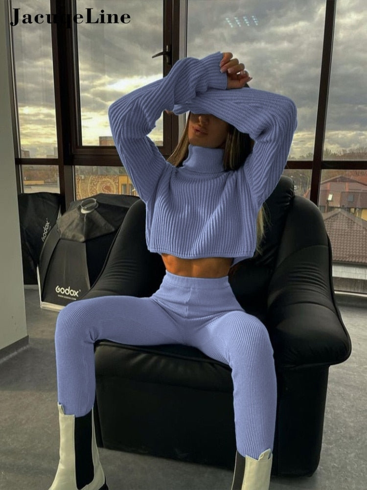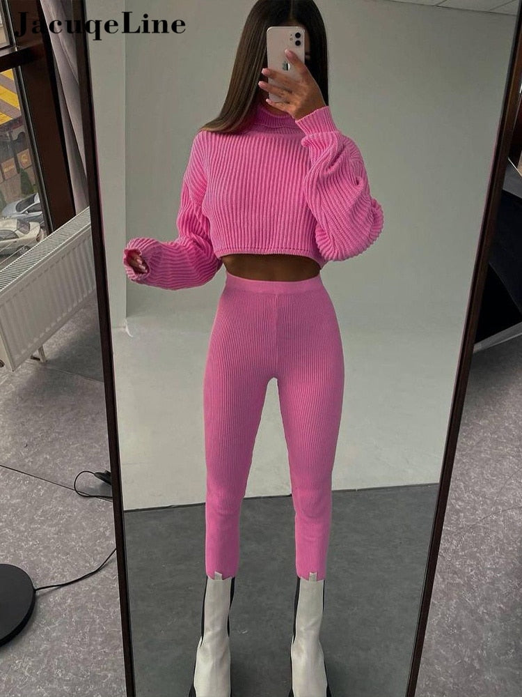 Jacuqeline 2022 Sexy Y2K Knitted Women's Suit Pencil Pants And Turtleneck Crop Top Two Piece Set Woman Outfits Autumn Winter