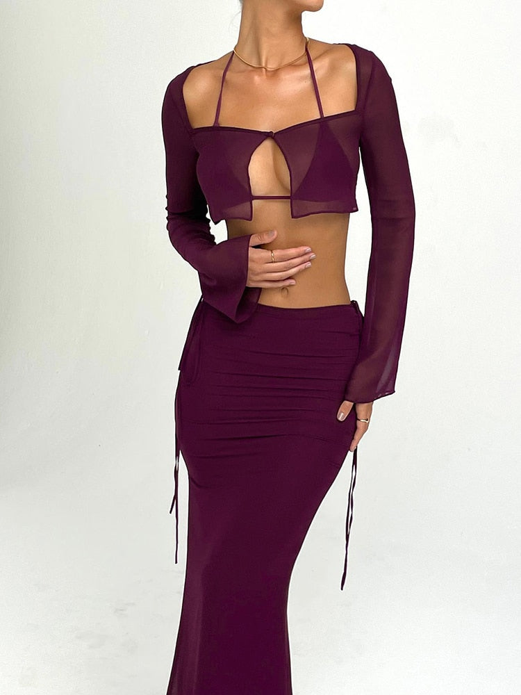 Jacuqeline 2022 Summer Green Sexy See Through Lace Dress Sets Women Long Sleeve Tops And Midi Skirts Beach Elegant 2 Piece Sets