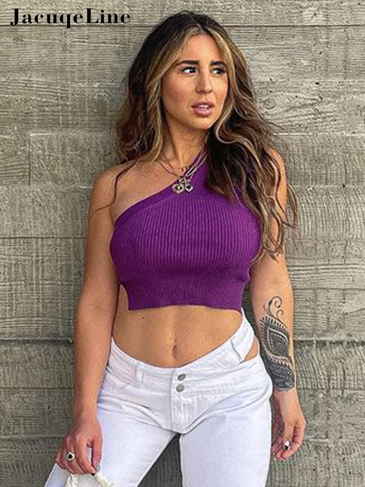 Jacuqeline 2022 Summer Knit y2k Crop Top Women Sexy One Shoulder Backless Tank Tops Casual Basic Sleeveless Camis Beach Fashion