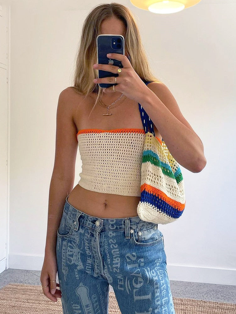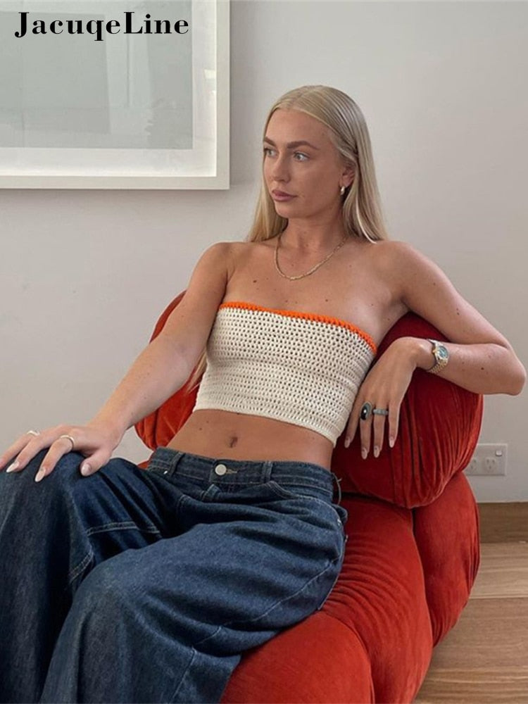 JacuqeLine 2022 Summer Y2K Green Knitted Strapless Crop Top Women Sleeveless Patchwork Vintage Bandage Sexy Tank Tops Backless