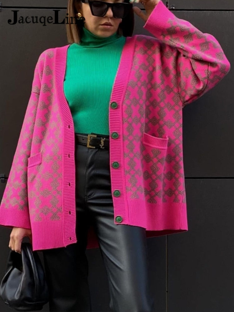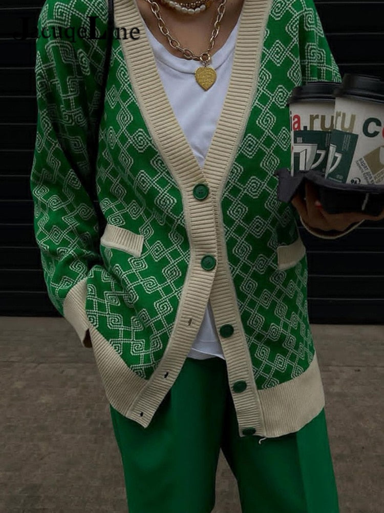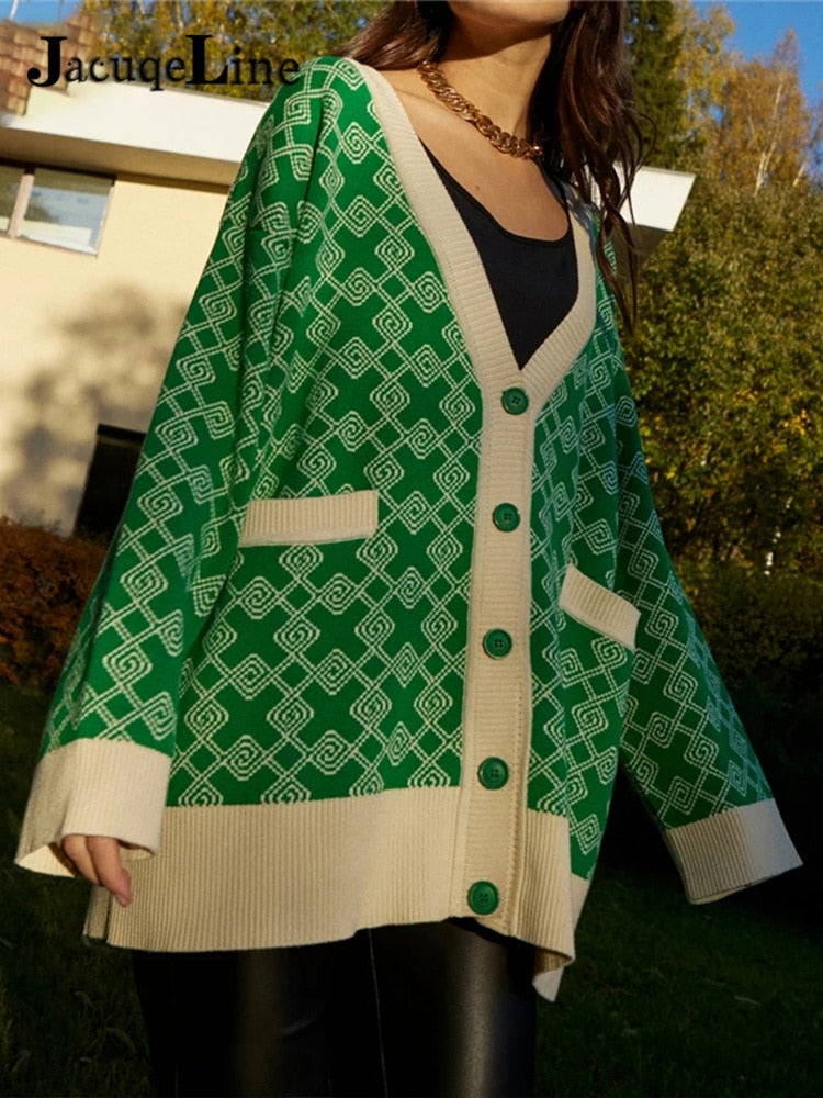 Jacuqeline Autumn Winter 2021 Oversize Knitted Women Cardigan Long Sleeve V Neck Sweater Fashion Plaid Casual Loose Cardigan