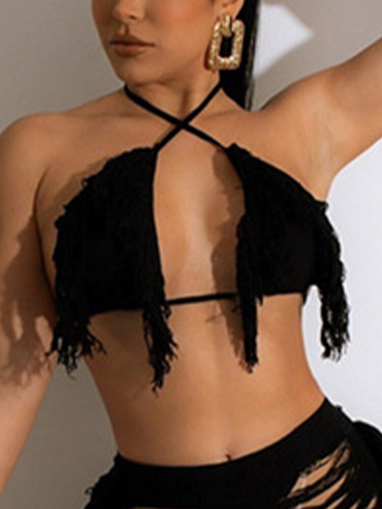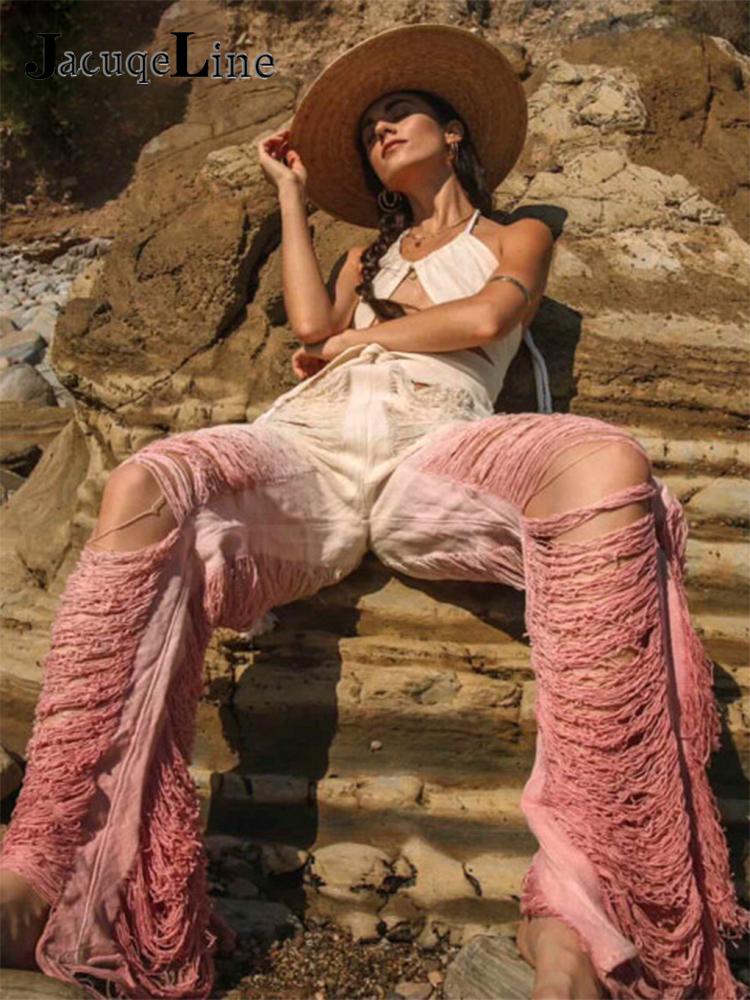 Jacuqeline Beach Sexy High Waist Y2K Wide Leg Pants Women Fashion Tassel Knit Sets Hollow Out Long Trousers And Tops 2022 Summer