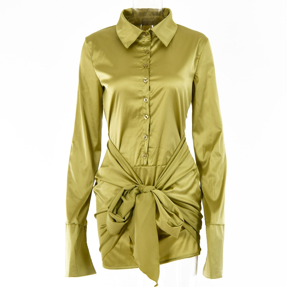 JULISSA MO Fashion Long Sleeve Bandage Satin Mini Dresses Women's Autumn Turn Down Collar Sexy Party Dress Femme Evening Clothes
