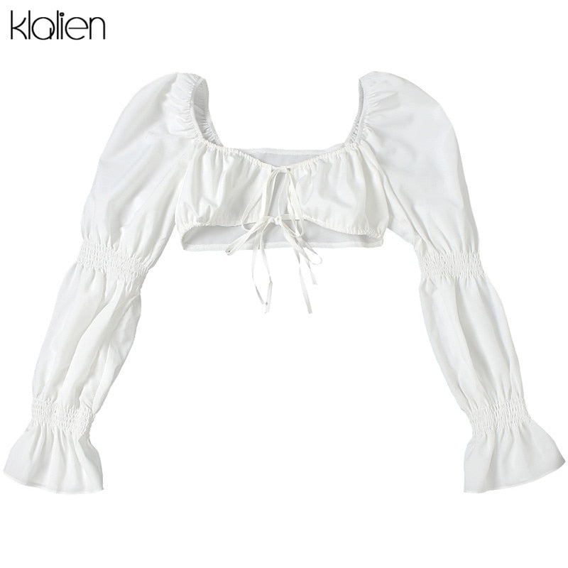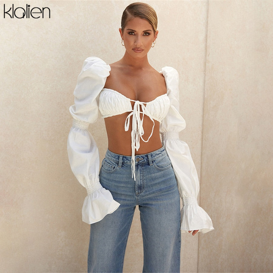 KLALIEN Fashion Sexy Bandage Low Chest Beach T Shirt Women Elegant White Lantern Sleeve French Romantic Slim Wild Female Top