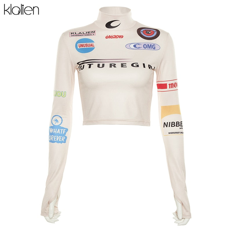 KLALIEN Harajuku printing Women Casual Fashion T-shirt 2020 autumn Long Sleeve Elastic high Neck Tight Sports Basic Shirt mujer