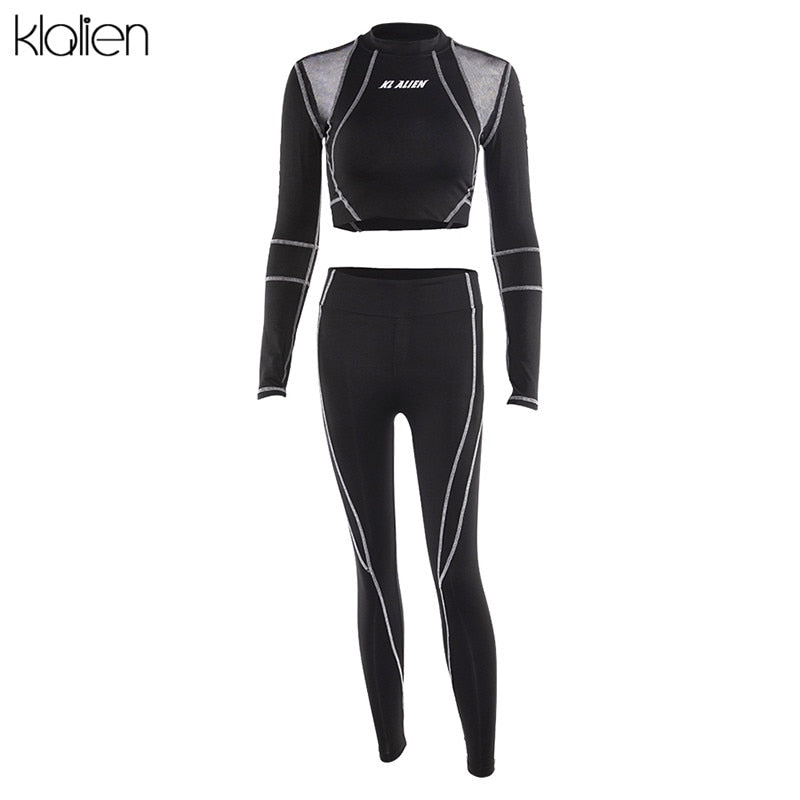 KLALIEN Letter Print Turtleneck Top + Leggings Striped Patchwork Fashion Casual Women Fitness Sport Two Pieces Set Tracksuits