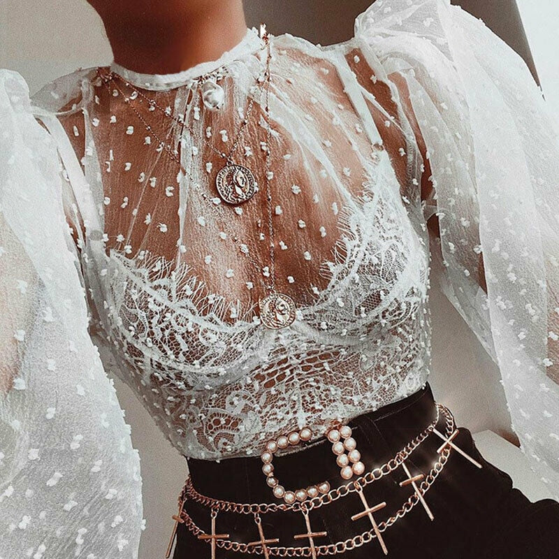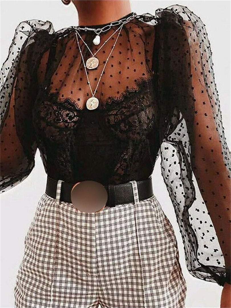 Ladies Women Sexy See Through Mesh Sheer O Neck Blouse Clubwear Shirt Tops Mesh Transparent Blouses Polka Dot Print Blouse Top