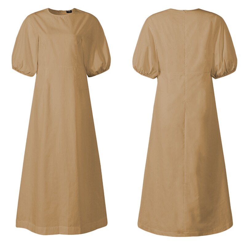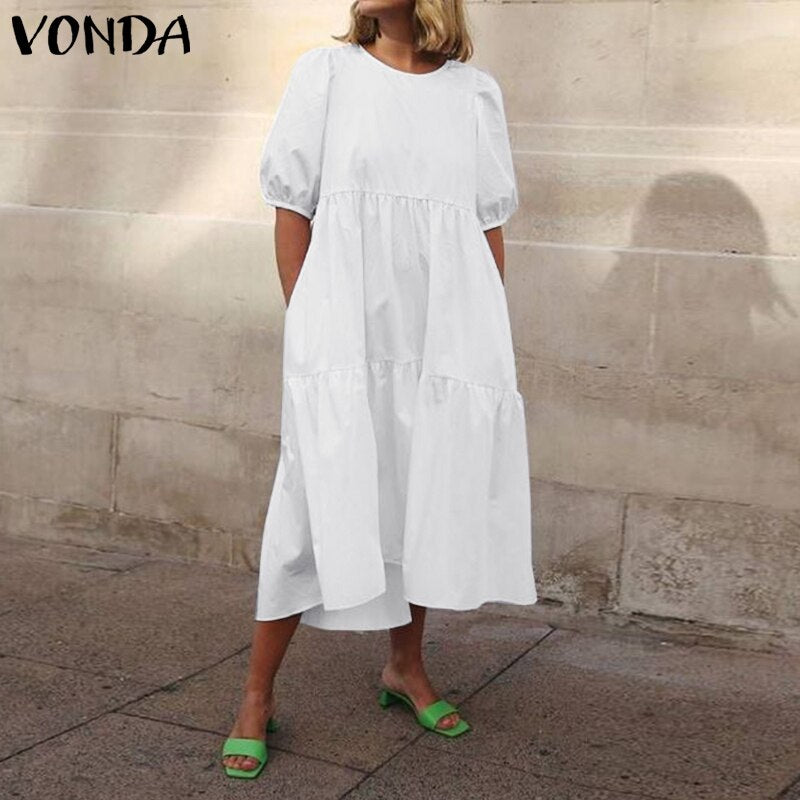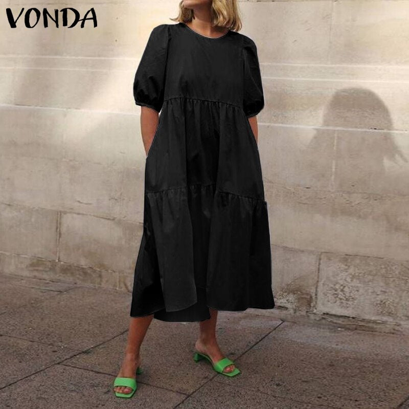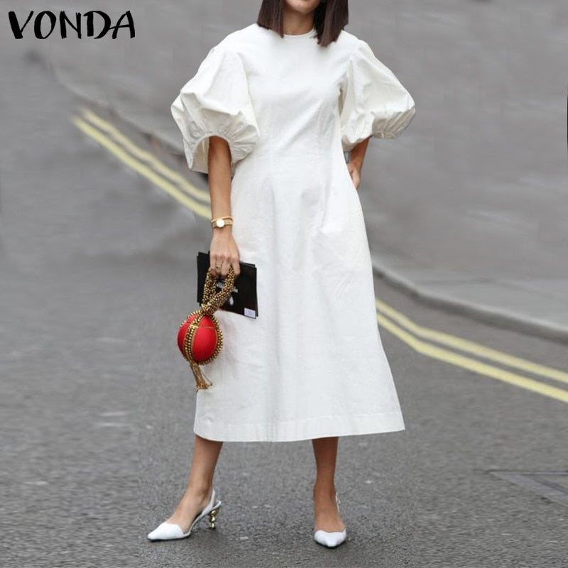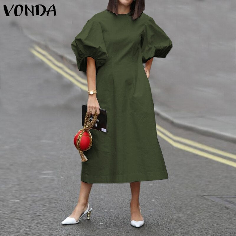Mid-Calf Dress 2022 VONDA Woman Summer O Neck Short Lantern Sleeve Dresses Bohemian Party Vestidos Femme Mid-Calf Length Robes