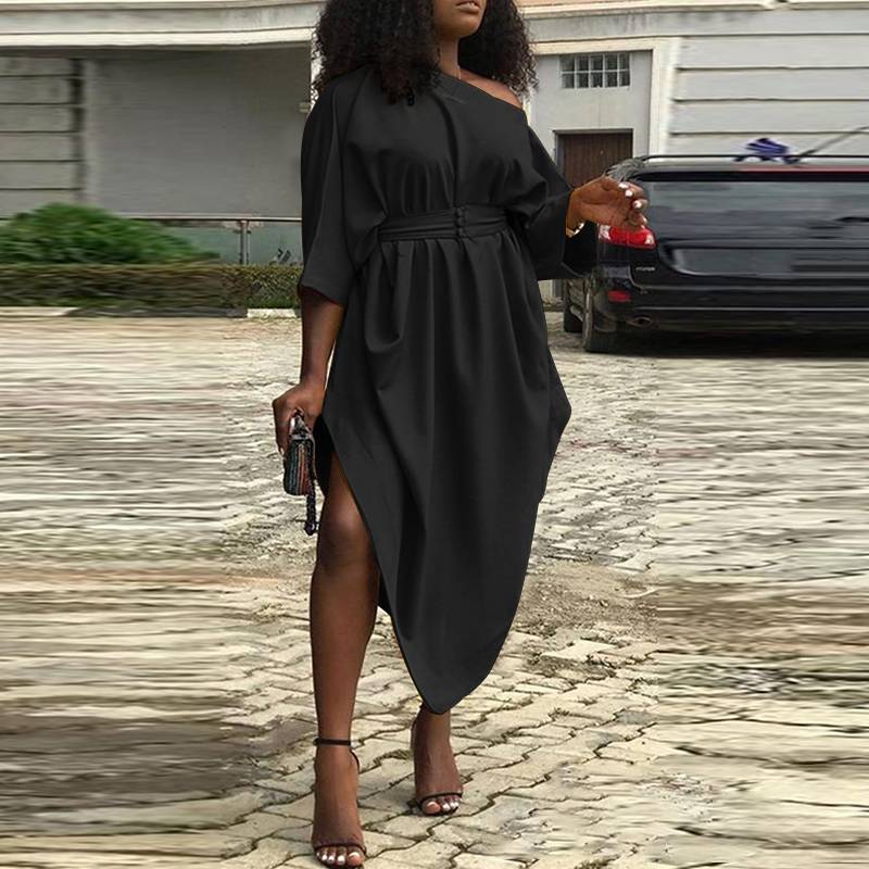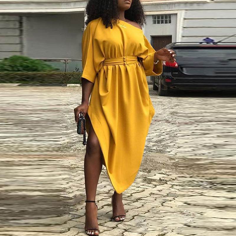 Office Dress Women Sexy Off Shoulder Dress 2022 VONDA High Waist Solid Asymmetrical Party Sundress Casual Midi Vestidos Belted