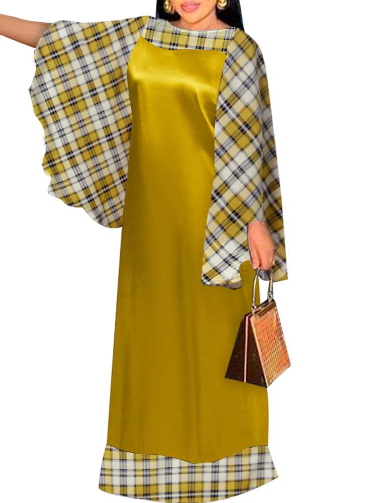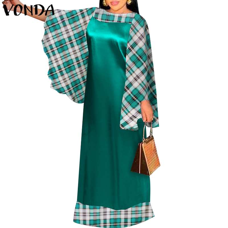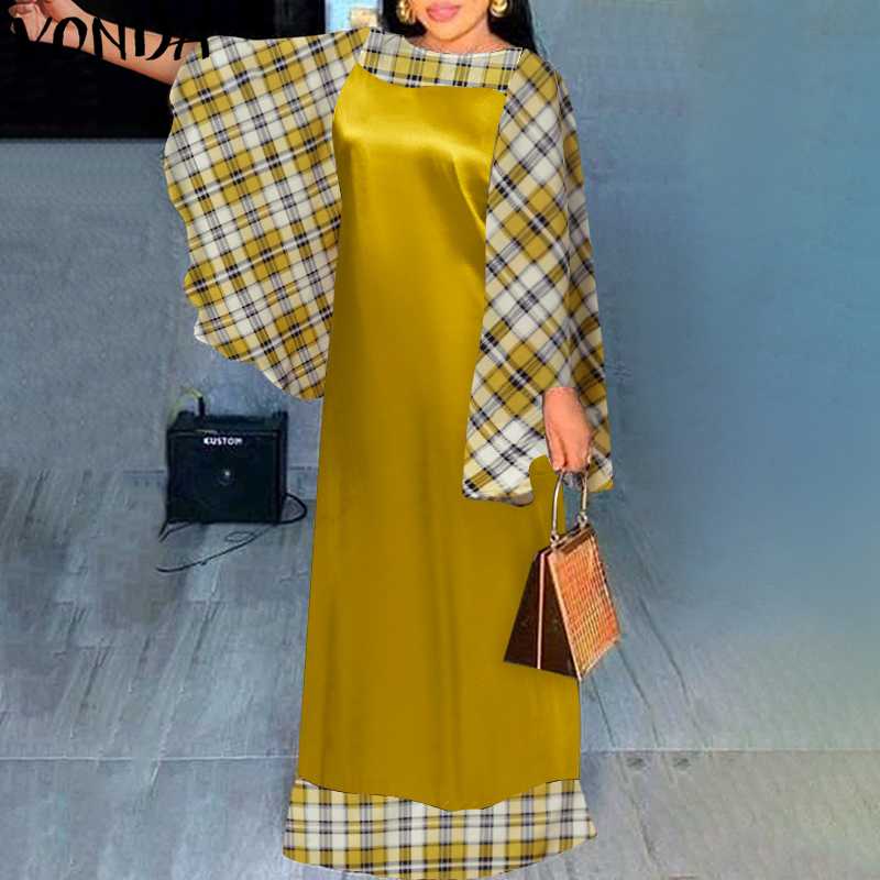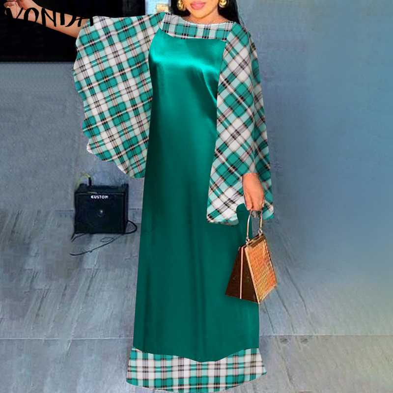 Patchwork Plaid Dress Holiday Party Maxi Long Dress VONDA 2022 Women Casual Vintage Long Sleeve Vestidos Oversized Robe Femme