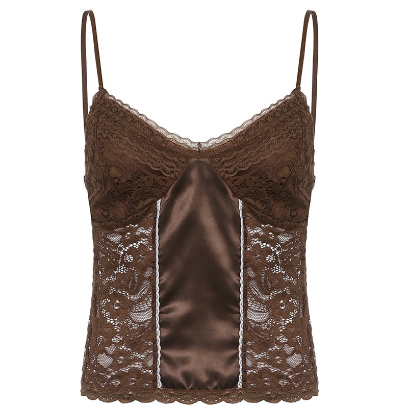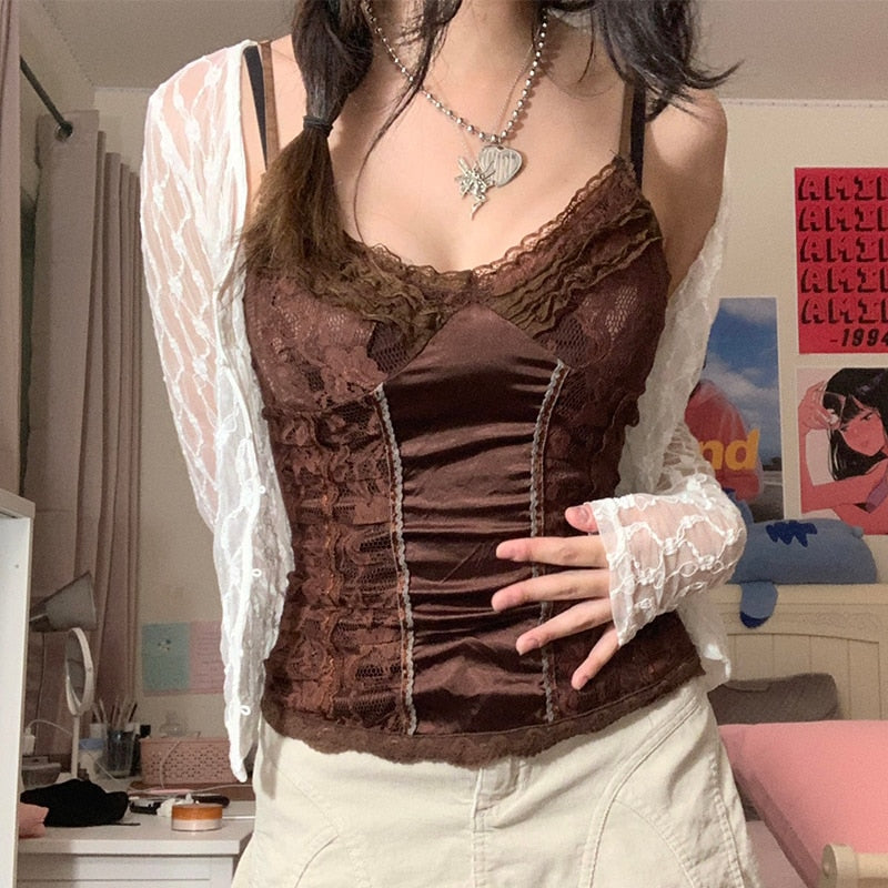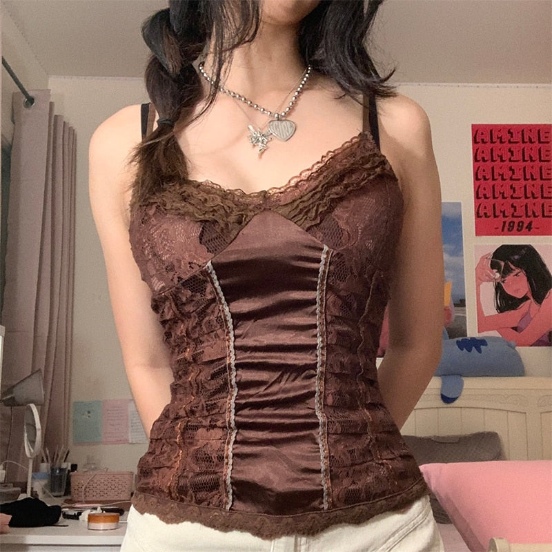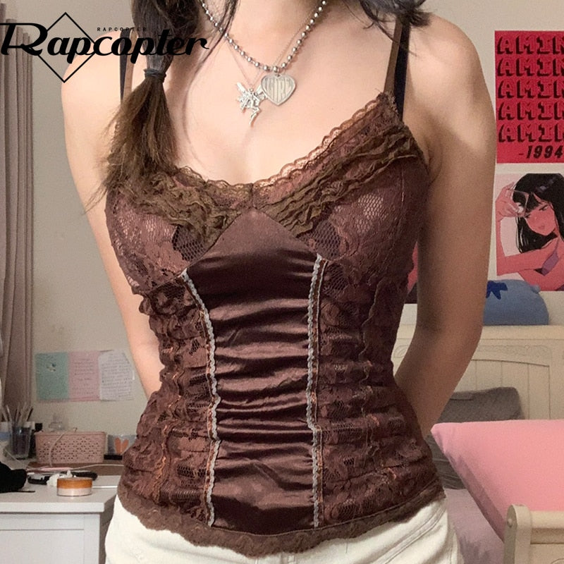 Rapcopter Y2K Brown Lace Crop Top Frill Satin Patched Mini Vest Backless V Neck Tank Tops Women Retro Sweet Cute Corset Sweats