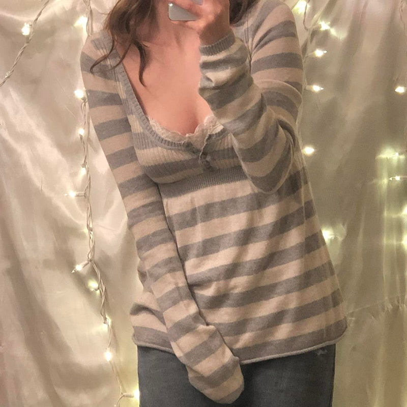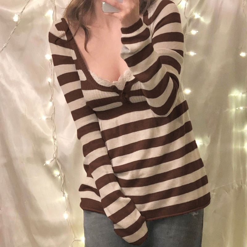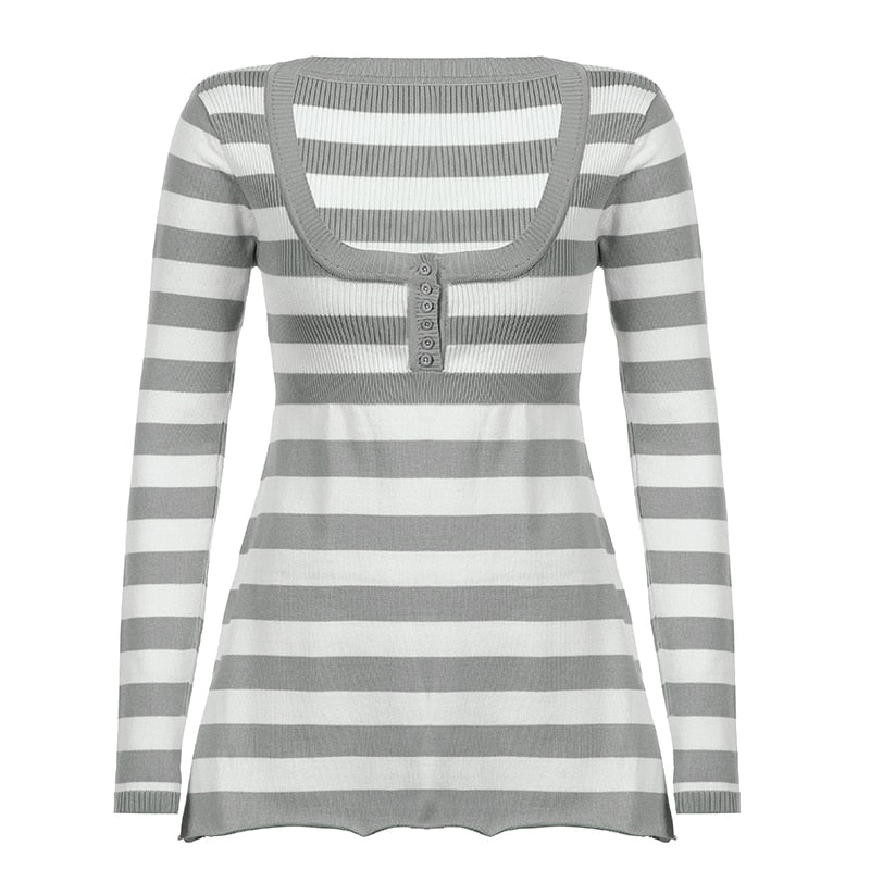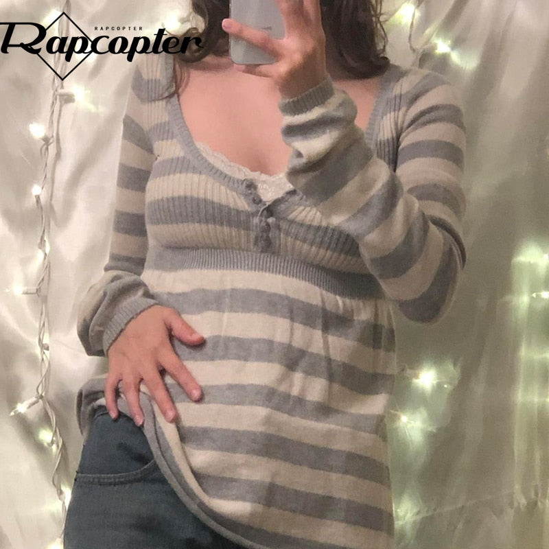 Rapcopter Y2K Button Sweaters O Neck Full Sleeve A-Line Jumpers Sweet Cute Striped Pullovers Women Autumn Winter Knitwear Retro