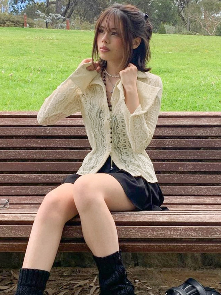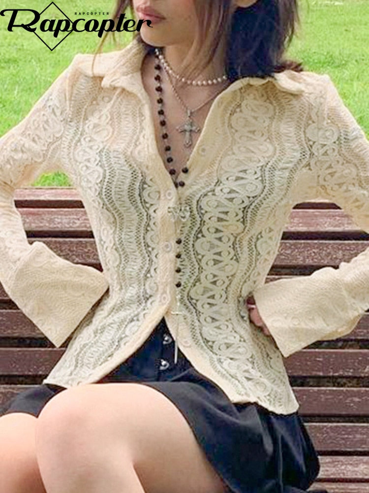 Rapcopter y2k Lace Crop Top See Through Button T Shirt Cute Full Sleeve Turn Down Collar Elegant Tee Women Retro Korean Chic Top