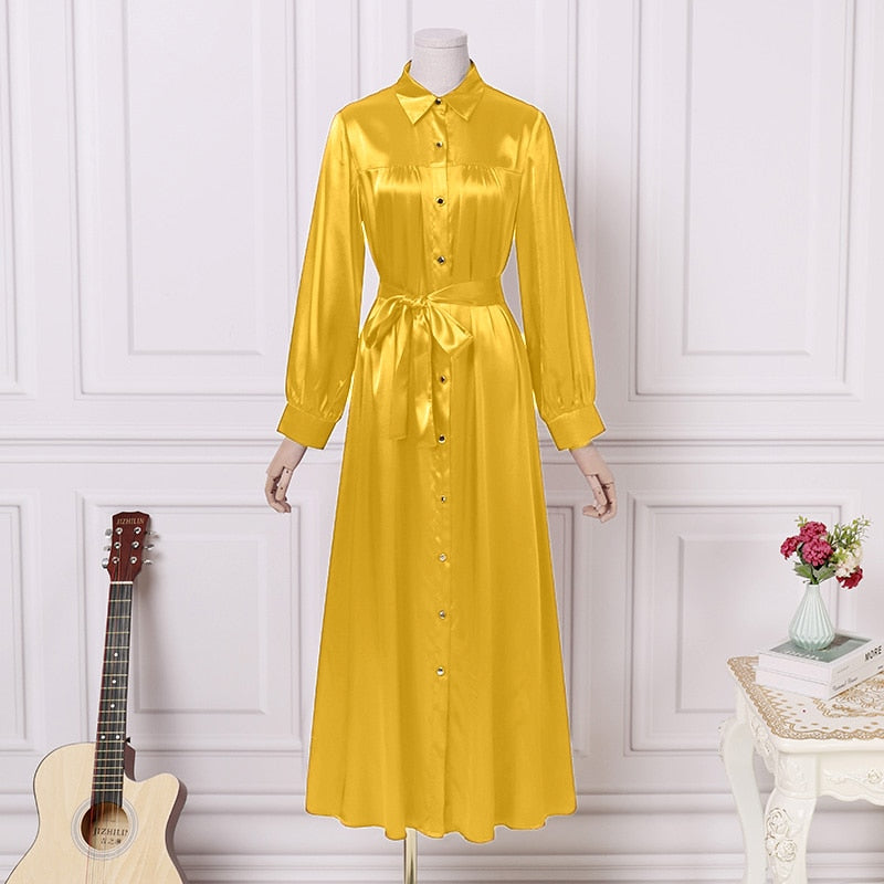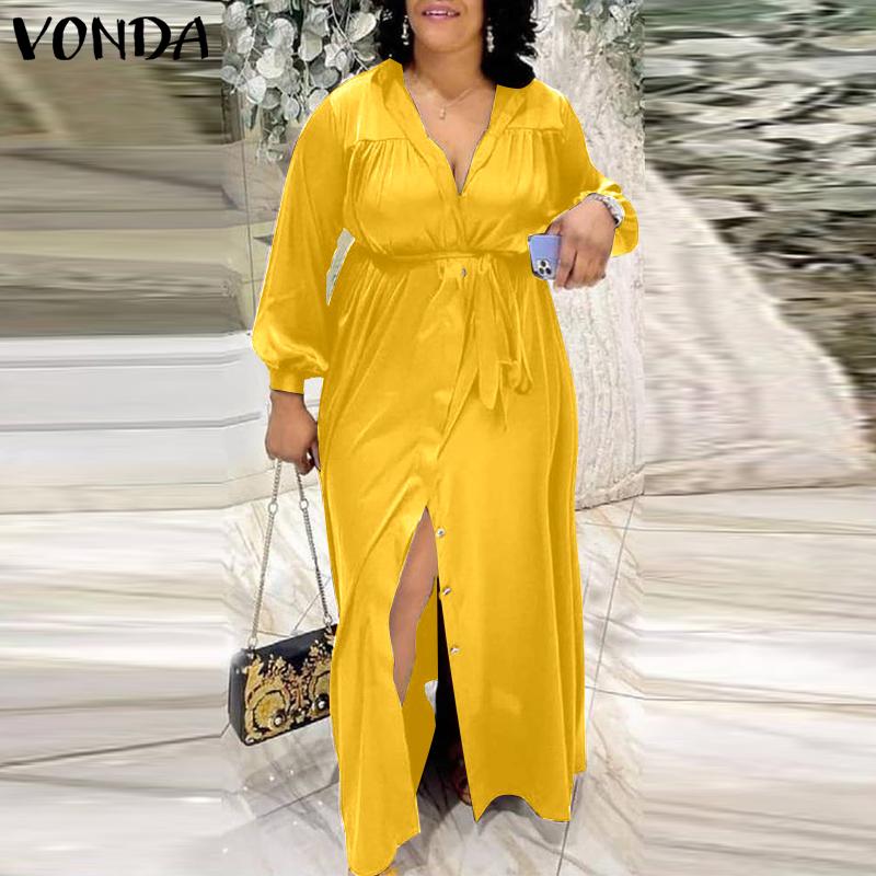 Satin Slik Dress VONDA 2022 Women Turn Down Neck Autumn Long Sleeve Shirt Dresses Lapel Button Down Bohemian Party Vestidos