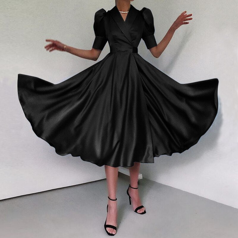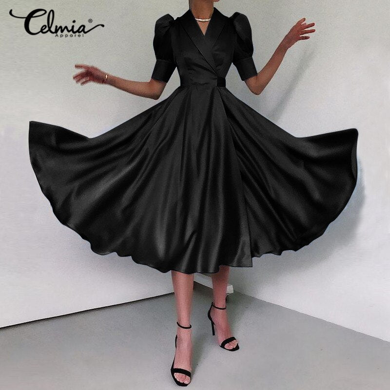 Sexy V-Neck Elegant Satin Shirt Dress 2021 Celmia Women Summer Sundress Casual Puff Sleeve Bandage Pleated Solid Party Vestidos