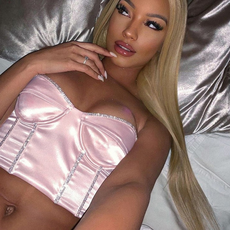 Sexy Women's Diamonds Tube Tops Fashion Strapless Wrapped Chest Club Tops Ladies Bow V-Collar Slim Bright Crystal Sequin Tanks
