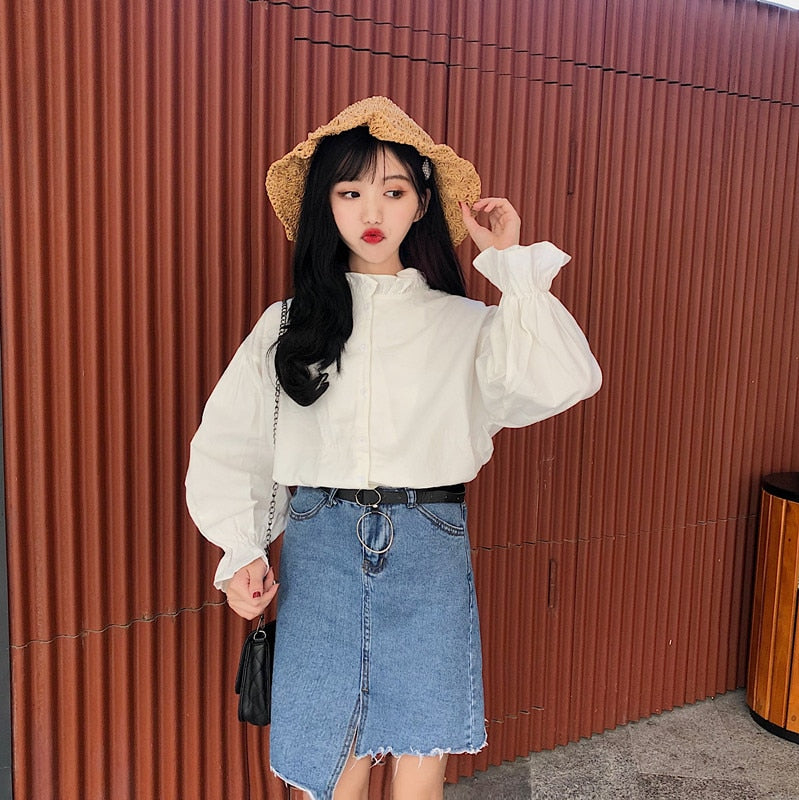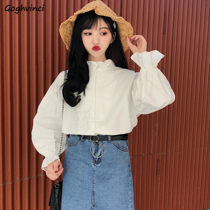 Shirts Women Ruffle Leisure Stand Collar Solid Flare Sleeve Womens Chic Pleated Loose Blouses Sweet Shirt Students All-match New
