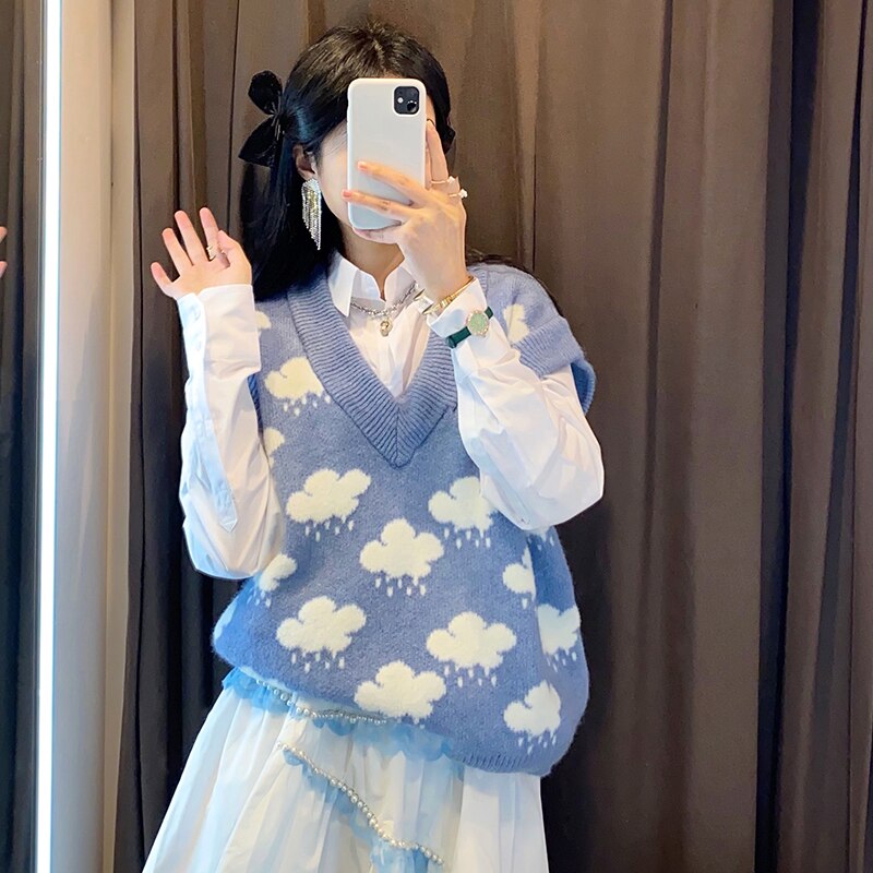 Sleeveless Cloud Print V-neck Sweaters Loose Knit Vest Top Winter Clothes Women Autumn Knitted Pullover Sweater Vest Women 15990