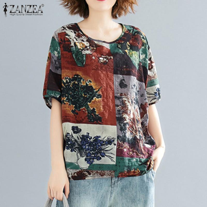 Summer Blouse ZANZEA Women Vintage Printed Tops Casual O Neck Short Sleeve Shirt Female Loose Tunic Blusas  Chemise