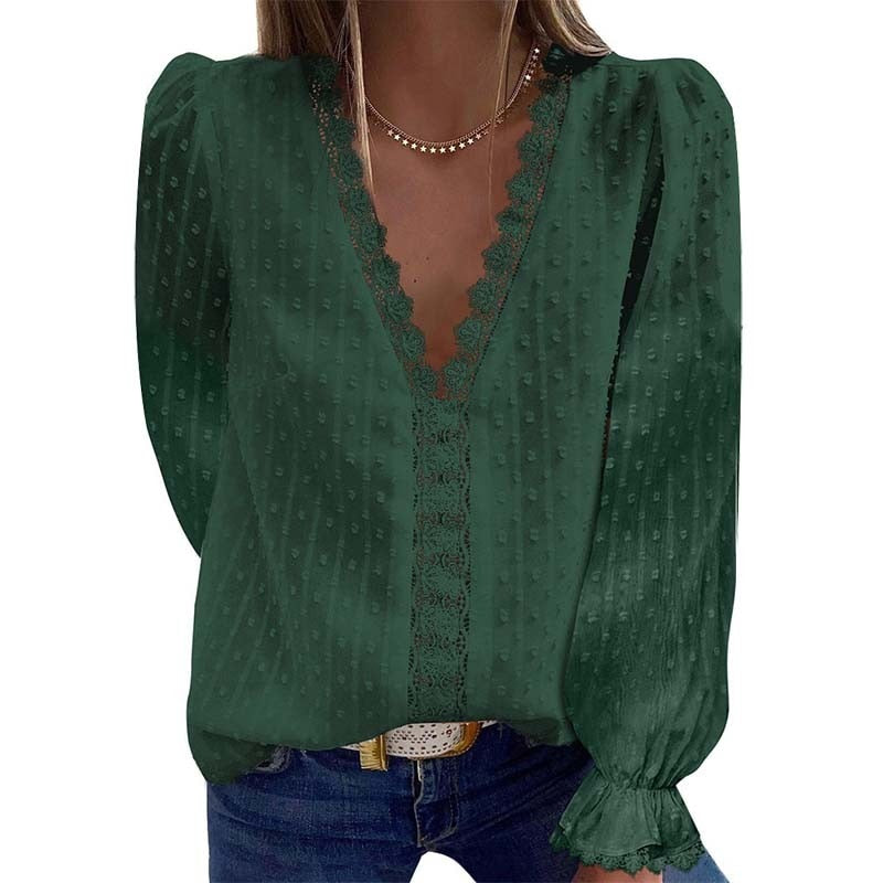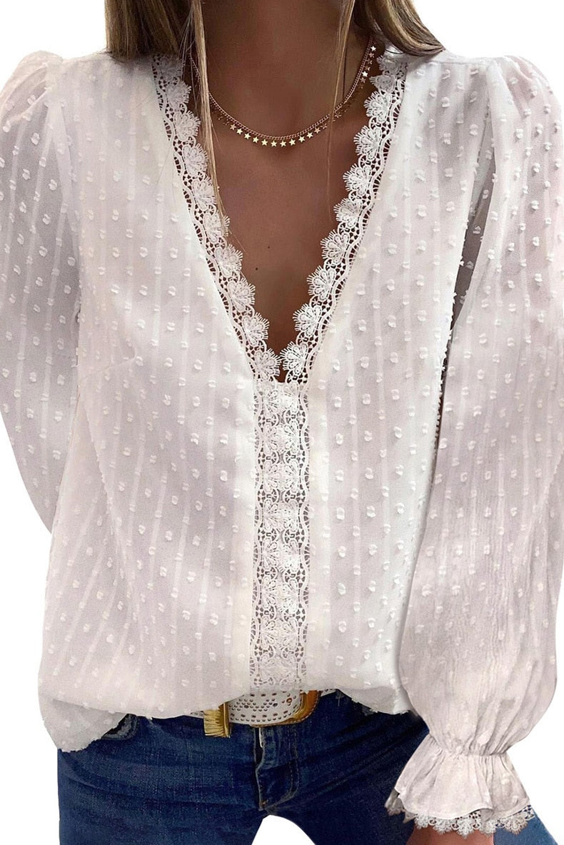 Summer Blouses Women Fashion Lace Patchwork V Neck Long Sleeve Casual Elegant Shirts Tops Office Work Plus Size Chiffon Blouse