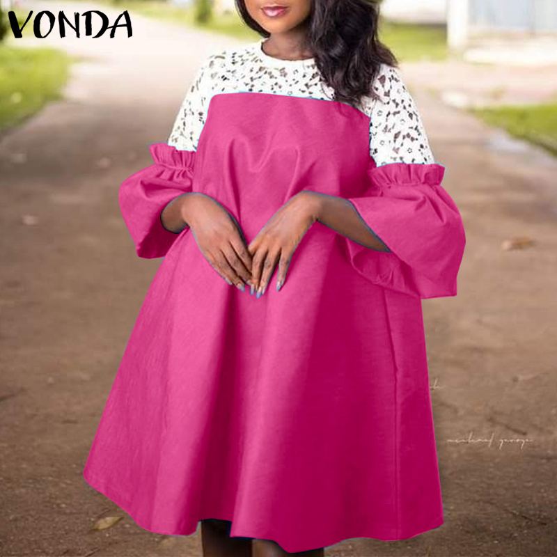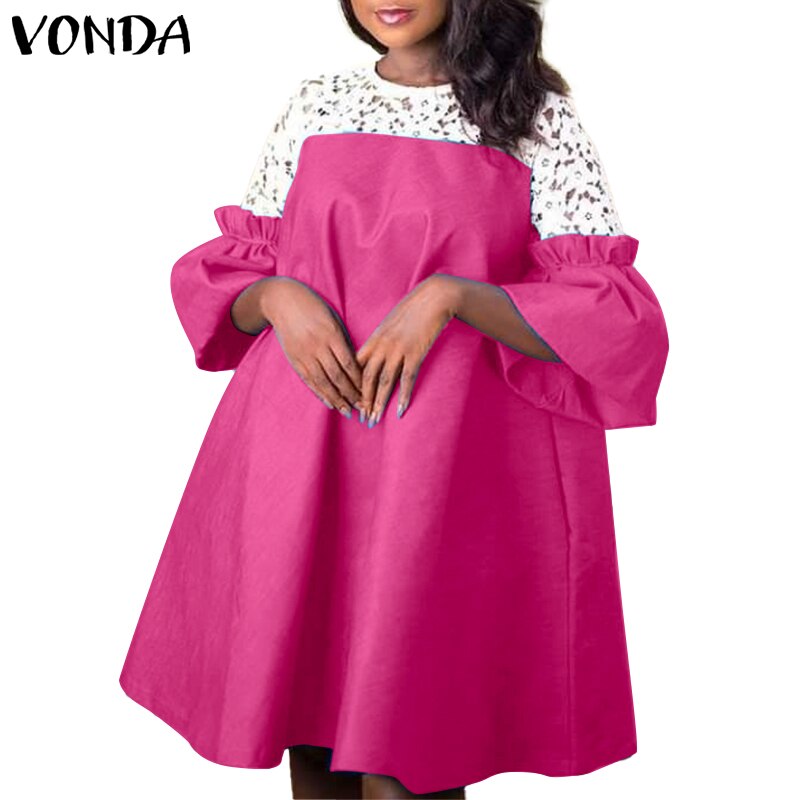 Summer Dress Casual Crew Neck Lace Mini Dresses VONDA 2022 Women Flare Sleeve Pleated 3/4 Sleeve Vestidos Short Robe Oversized
