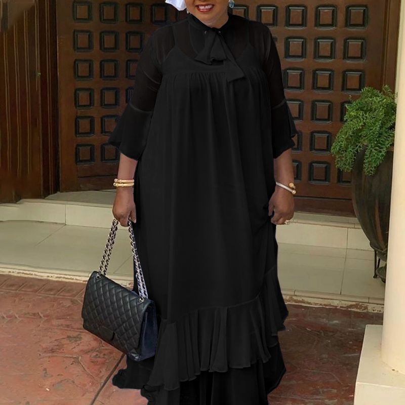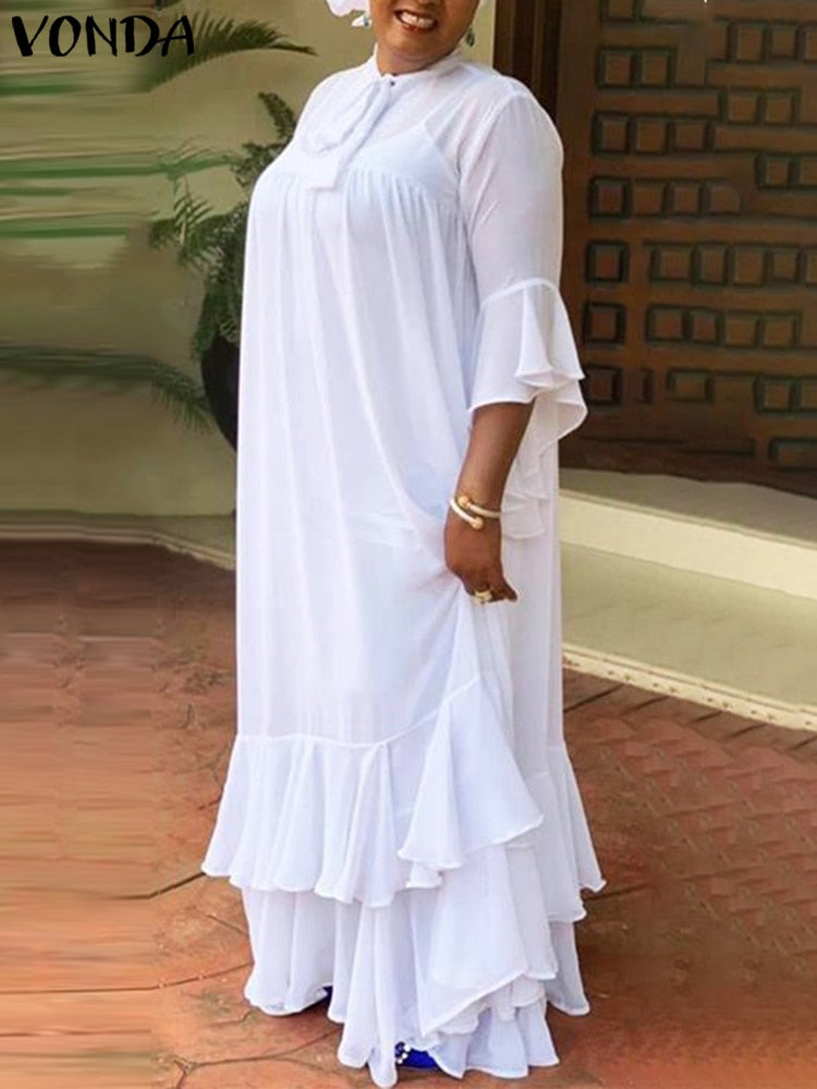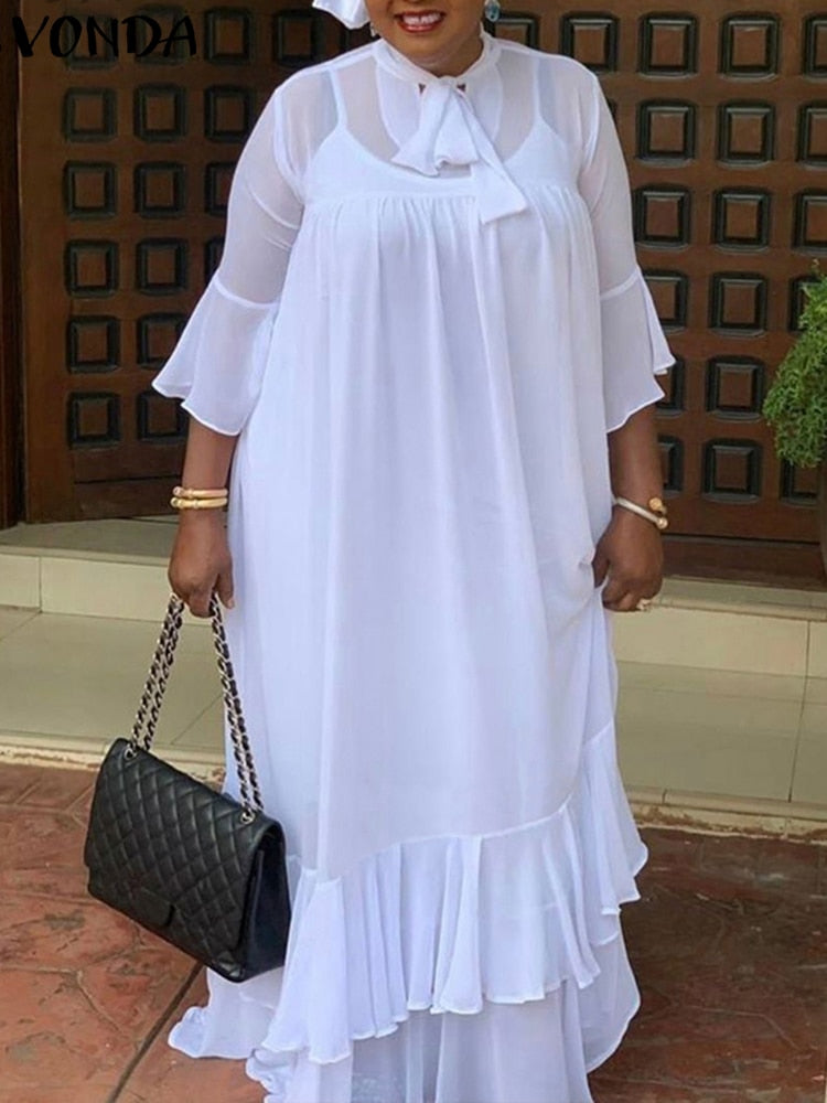 Summer Sleeveless Dress VONDA 2022 Women Bow Neck Flare Sleeve Pleated Ruffled Hem Long Maxi Dresses Bohemian Vestido Party Robe