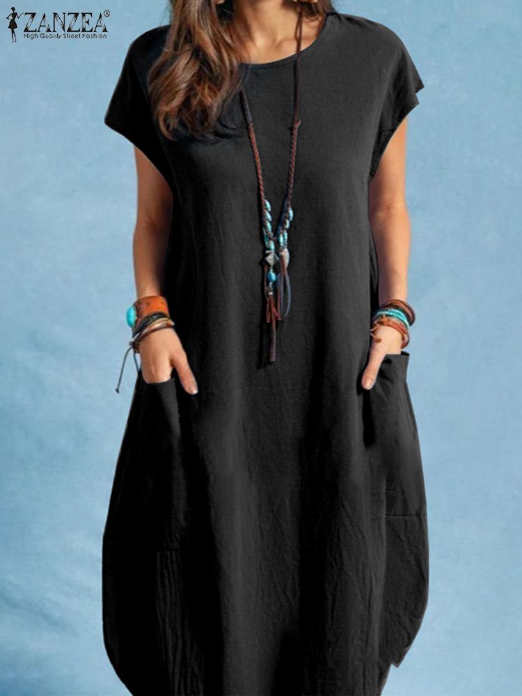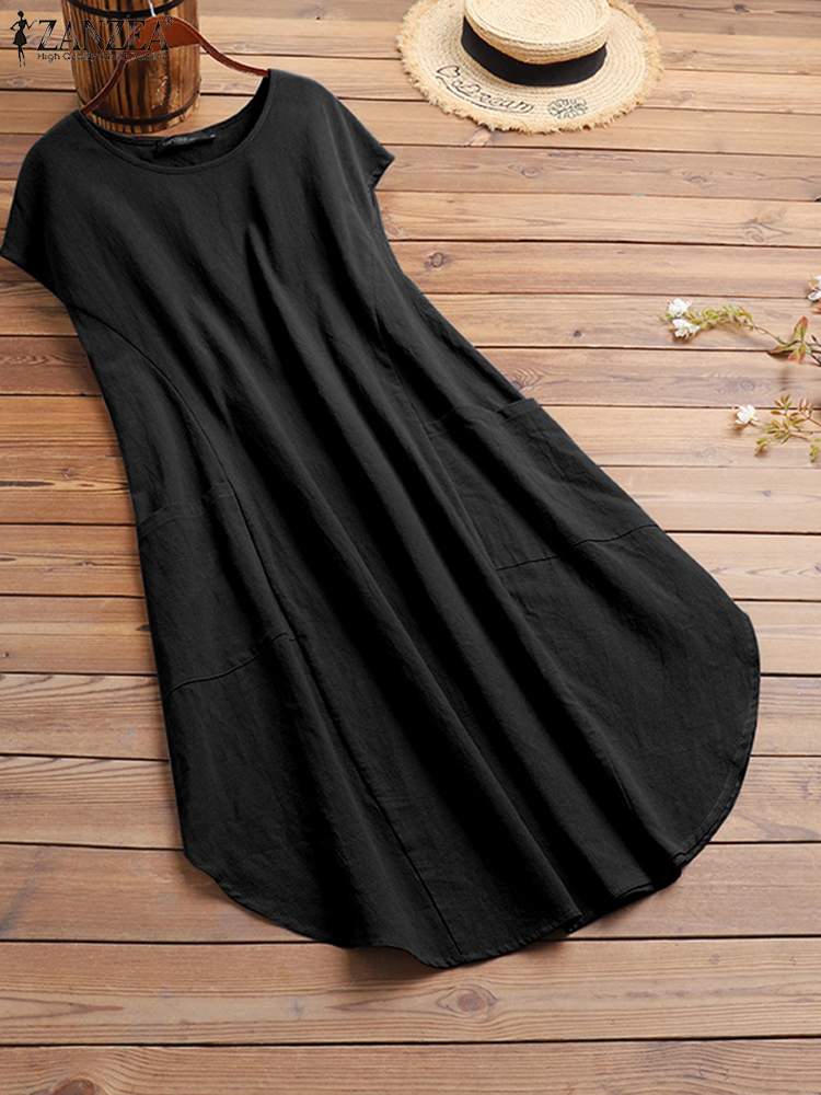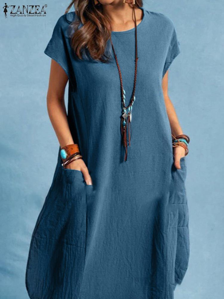 Summer Vintage Short Sleeve Solid Knee-length Dress ZANZEA Oversized Women Sundress Casual Loose Cotton Vestidos Beach Dresses