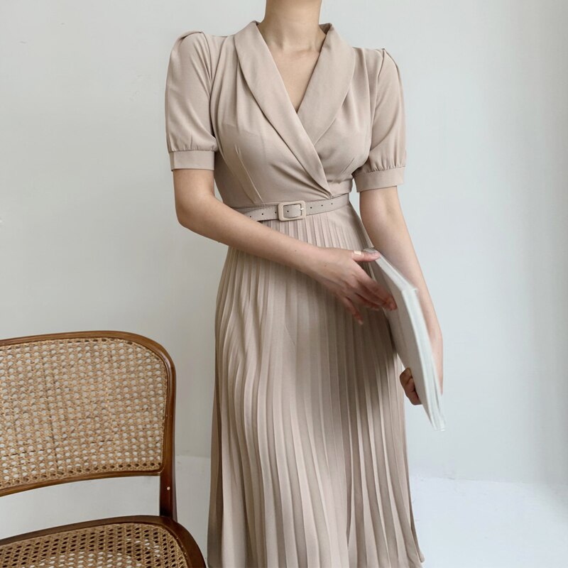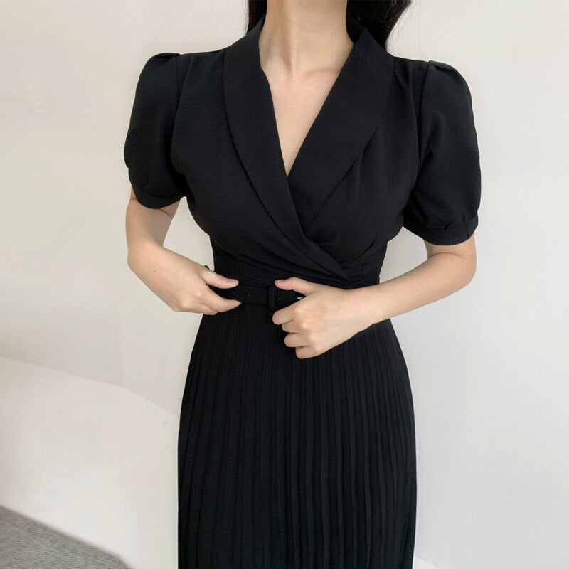 Summer Women Elegant Waist Belt Solid Ankle-Length Dress Office Lady Puff Sleeve Pleated Dress 2021 Fashion