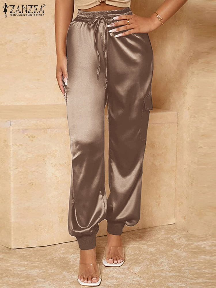 Summer Women Trousers ZANZEA Casual Elastic Waist Solid Satin Long Pants Female Loose Homewear 2022 Fashion OL Pantalon Turnip