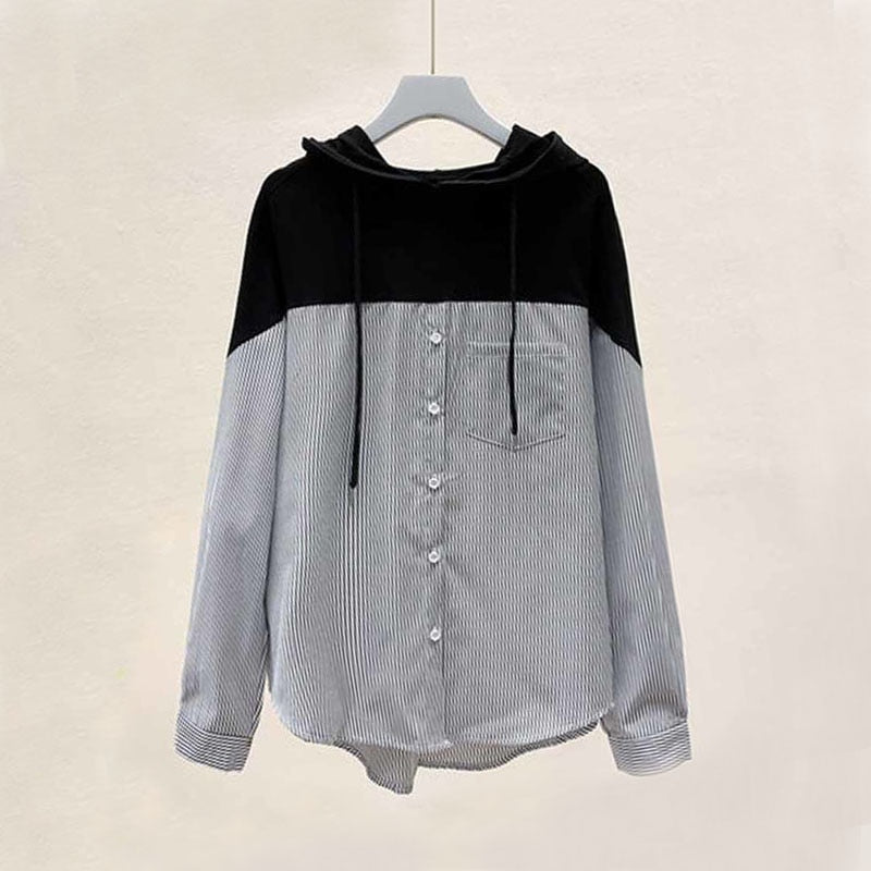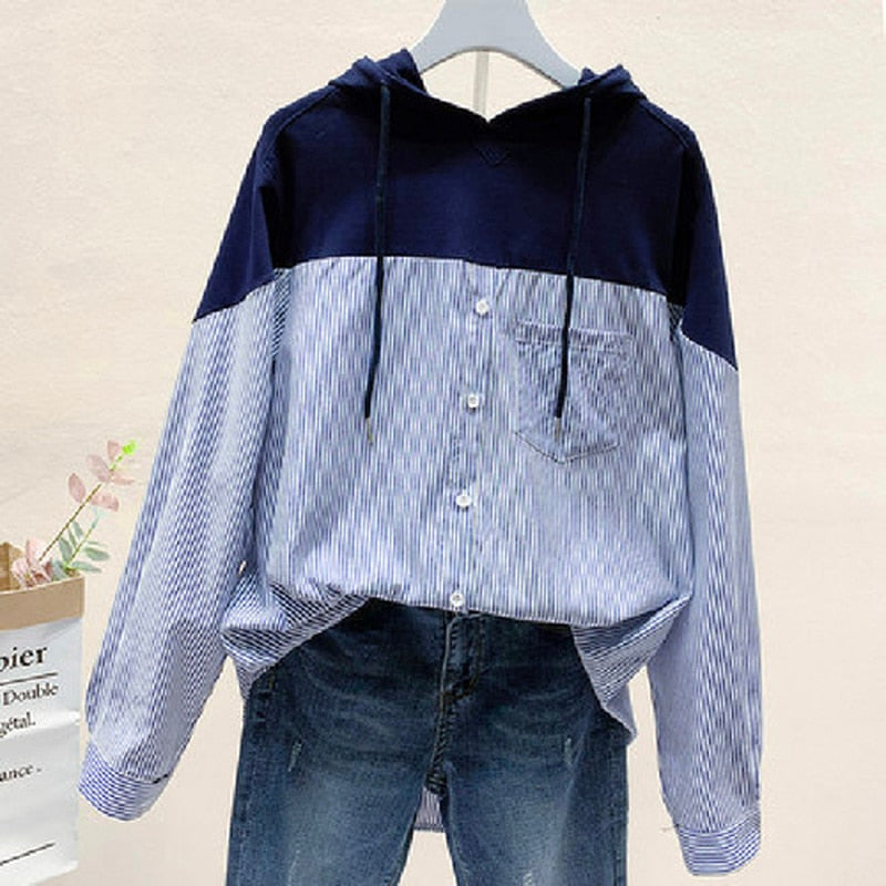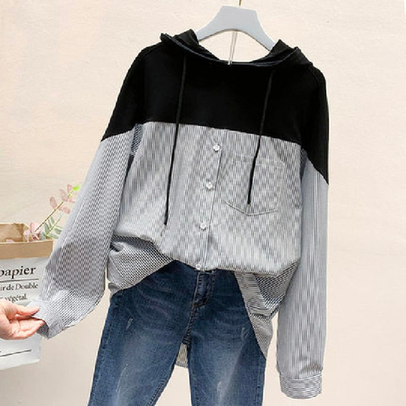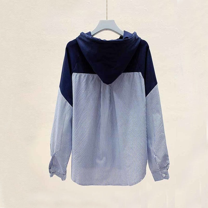 Sweatshirts Plus Size 2021 Autumn Hooded Striped Stitching Shirt Female Korean Style Loose Hoodies Women Drawstring Tops 11943