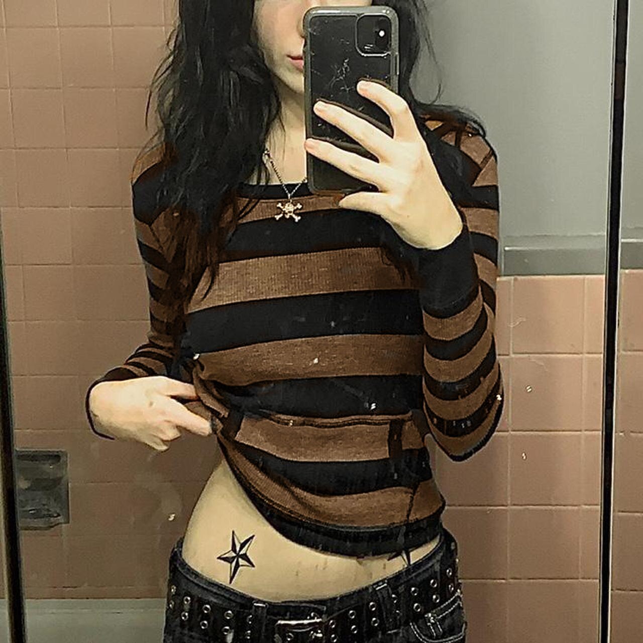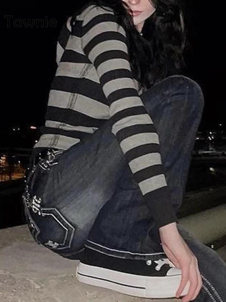 Tawnie 2022 Goth Fairycore Grunge Striped Hooded T Shirt Women Vintage Aesthetic Long Sleeve Tee Tops Y2K Casual Hoodie Tees