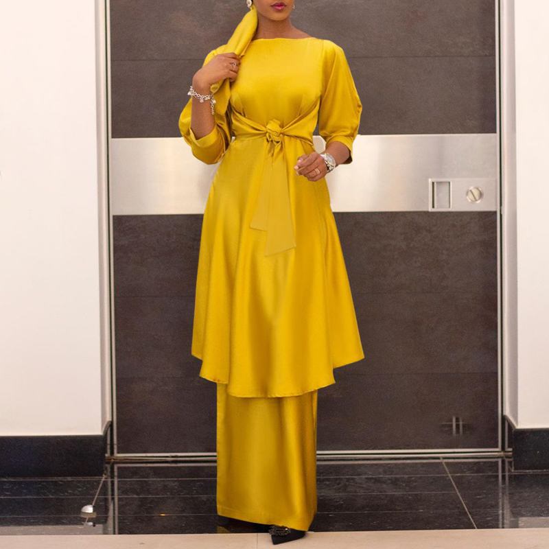 VONDA 2022 Elegant Skirt Sets Women Long Blouse Tunic Skirt Set 3/4 Sleeve Belted Satin Faldas Saia With High Waist Jupe Suits