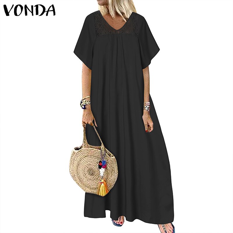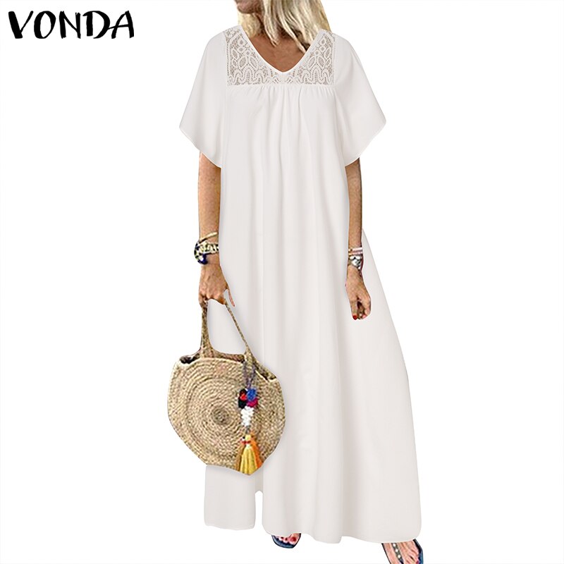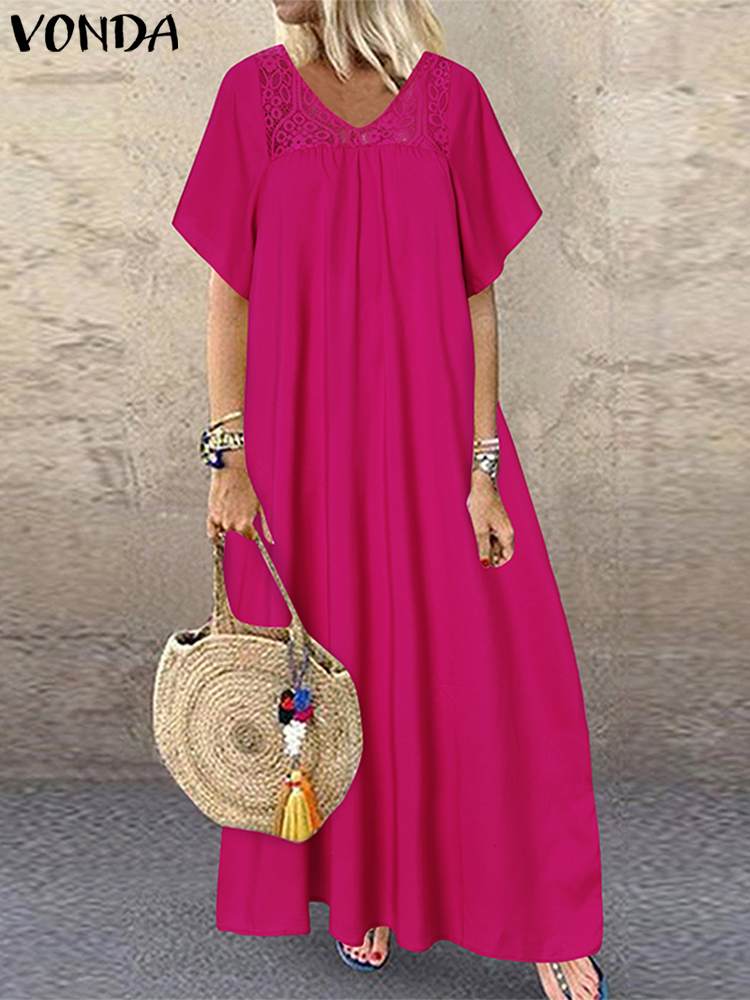 VONDA 2022 Women Fashion Casual Loose Sundress Bohemian Summer Retro Lace Patchwork Holiday Robe Half Sleeve V Neck Long Dress