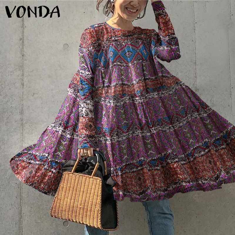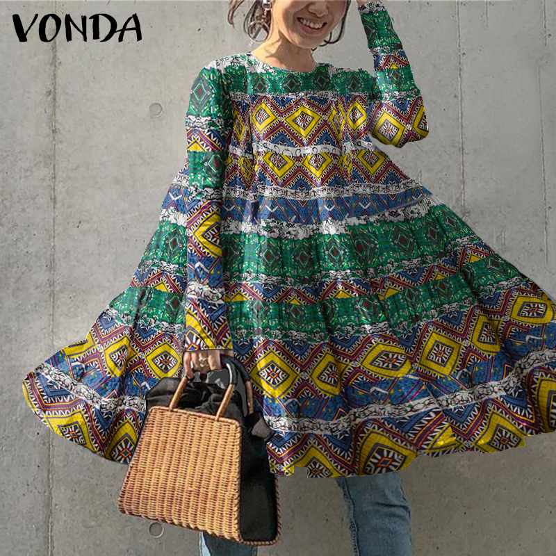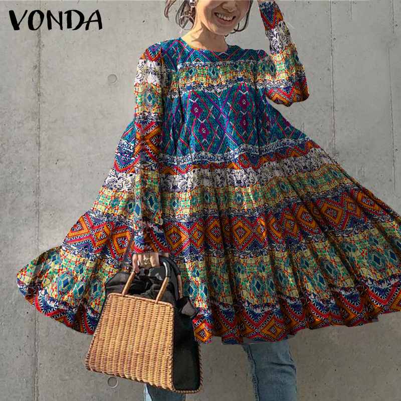 VONDA Autumn Dress Casual Long Sleeve O Neck Floral Print Ruffle Dresses Oversized Baggy Cotton Sundress Femme Bohemian Vestidos